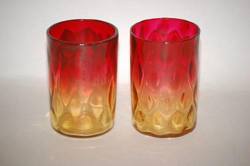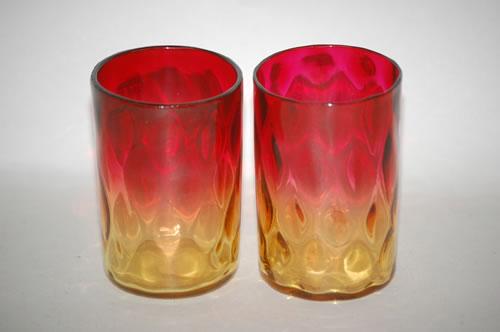 (2) AMBERINA ART GLASS TUMBLERS - (1) 3 3/4" DIAMOND QUILTED PATTERN TUMBLER W/ POLISHED BOTTOM (PROBABLY LIBBEY) & (1) 3 7/8" DIAMOND QUILTED TUMBLER W/ POLISHED BOTTOM (PROBABLY LIBBEY) - 1ST W/ MINOR RIM ROUGHNESS, BOTH W/ MINOR WEAR