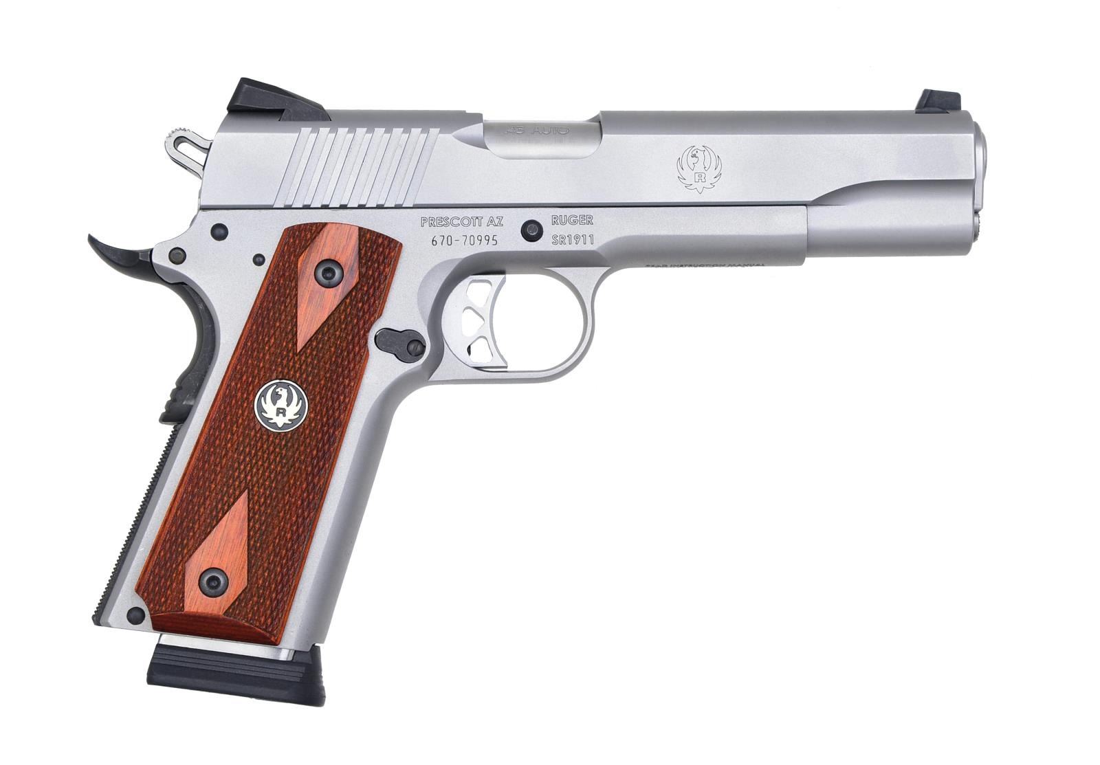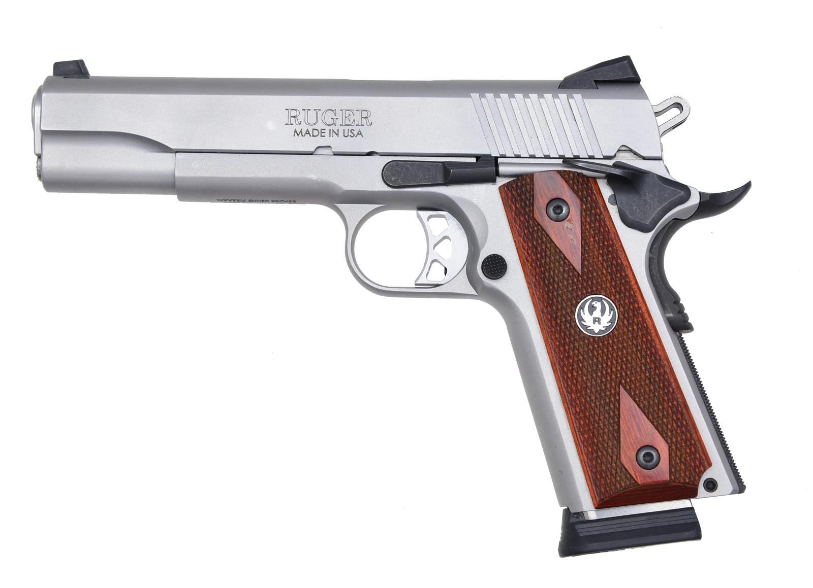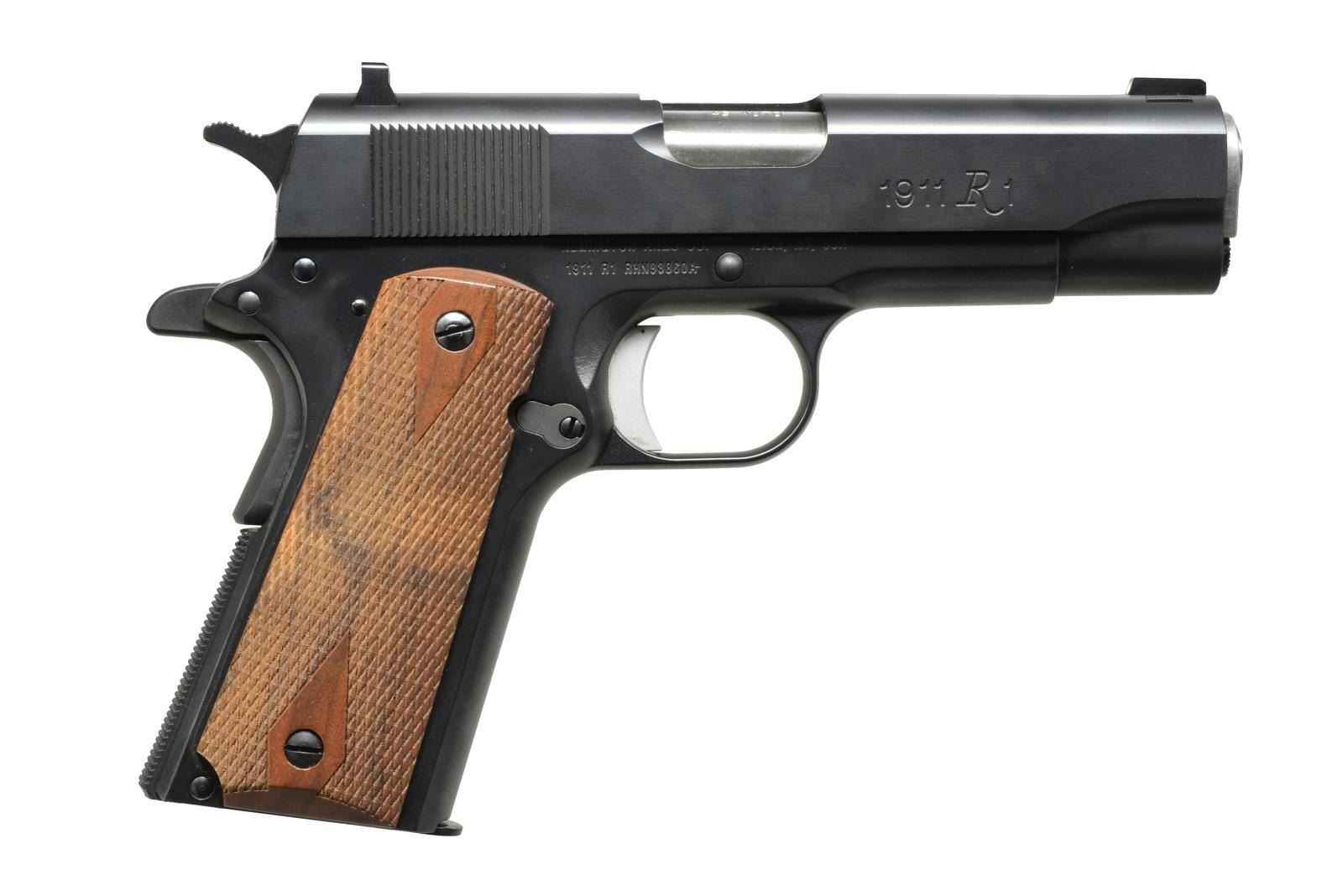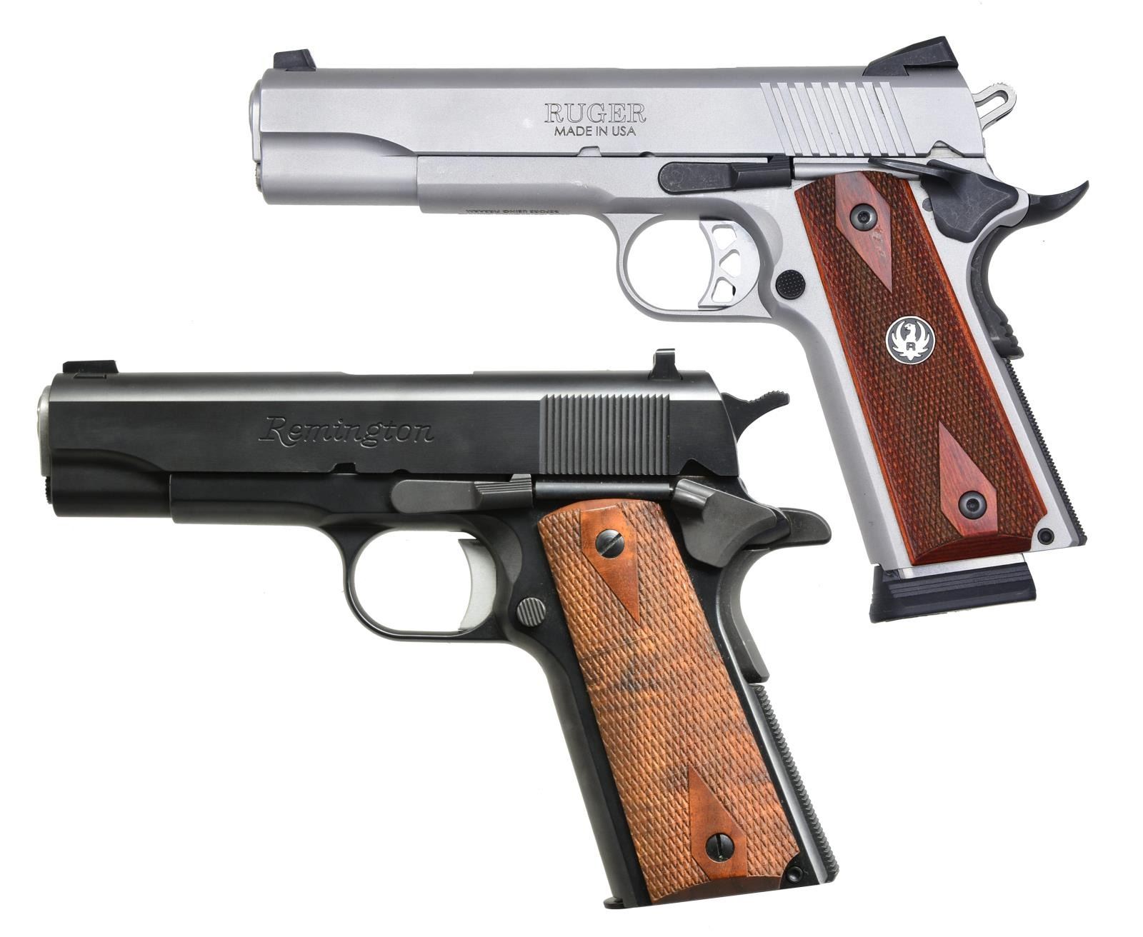 1) RUGER SR1911 45 AUTO PISTOL. Cal. 45 ACP. S# 670-70995. Bbl. 5" stainless steel. Dovetail white bead front sight & Novak style rear sight w/ 2 white beads. Checkered Ruger wooden grips w/ Ruger emblem on both grips. MAGS: 1 factory stainless steel w/ black Ruger marked base. UNATTACHED ACCESSORIES: matching numbered White Ruger box w/ accessories. CONDITION: gun retains original stainless steel finish. Grips have good checkering & original finish. Bore is very good. (20-3707/BT). 2) REMINGTON 1911 R1 45 AUTO PISTOL. Cal. 45 ACP. S# RHN93860A. Bbl. 4 3/4". Dovetail white bead front sight & dovetail fixed blade rear sight w/ 2 white beads. Walnut checkered grips. MAGS: 2 factory w/ bottoms marked “45 AUTO”. UNATTACHED ACCESSORIES: matching numbered Rem. green case w/ accessories. CONDITION: gun retains most of its factory blue finish w/ some minor sharp edge wear. Checkered grips are in excellent condition. Bore is very good. (20-3709/BT). BOTH MODERN. $1,200-1,800.