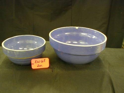 2 AMERICAN POTTERY BLUE BANDED BATTER BOWLS (1) 7in DIA. 3 1/2inT (W/CRACK), (1) 9inDIA. 4 1/2inT (W/CRACK & CHIP), 2 PC