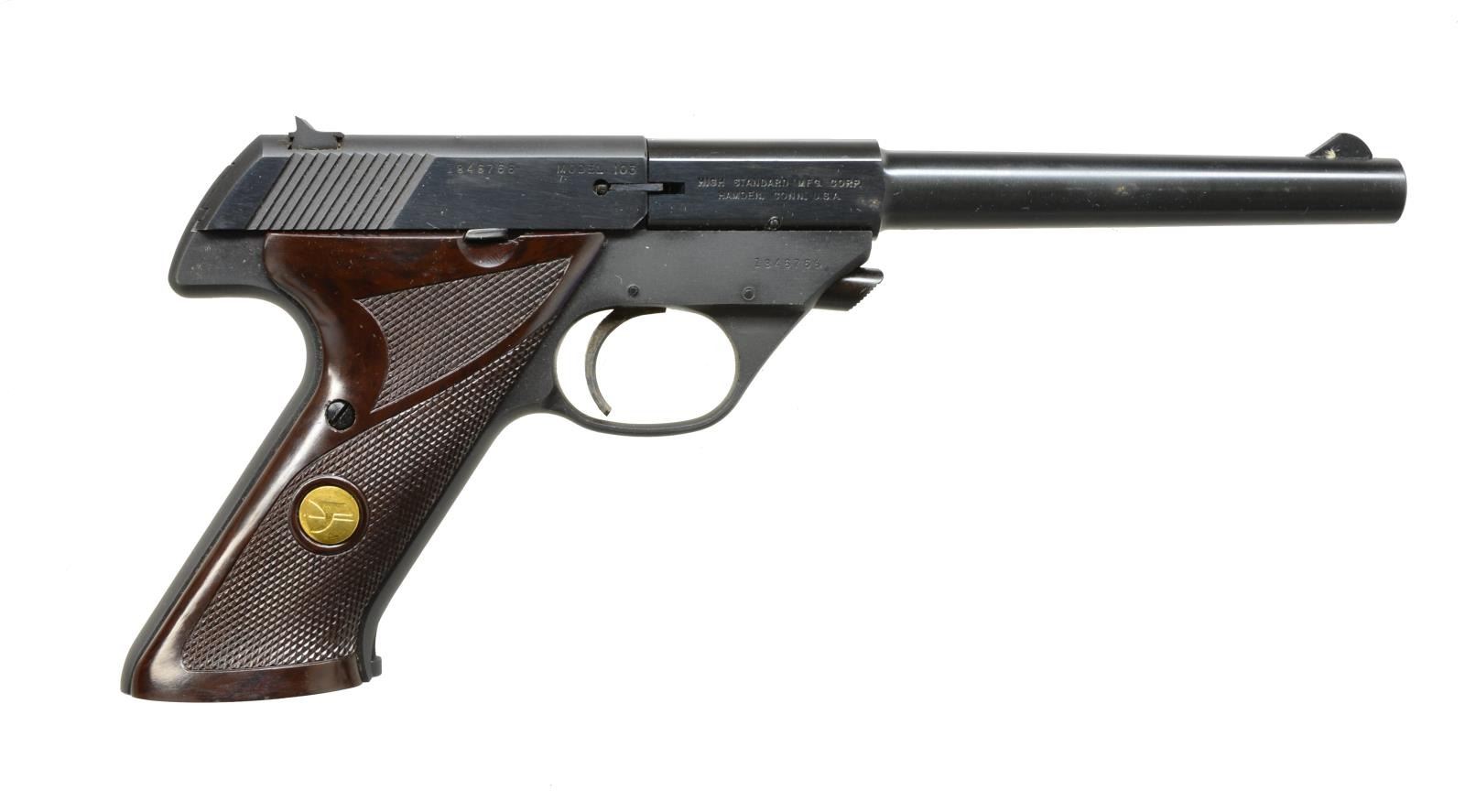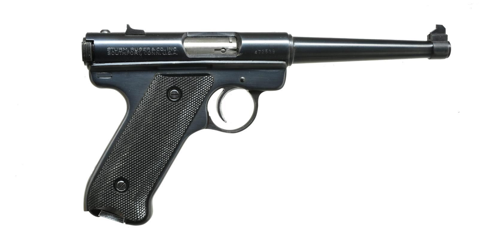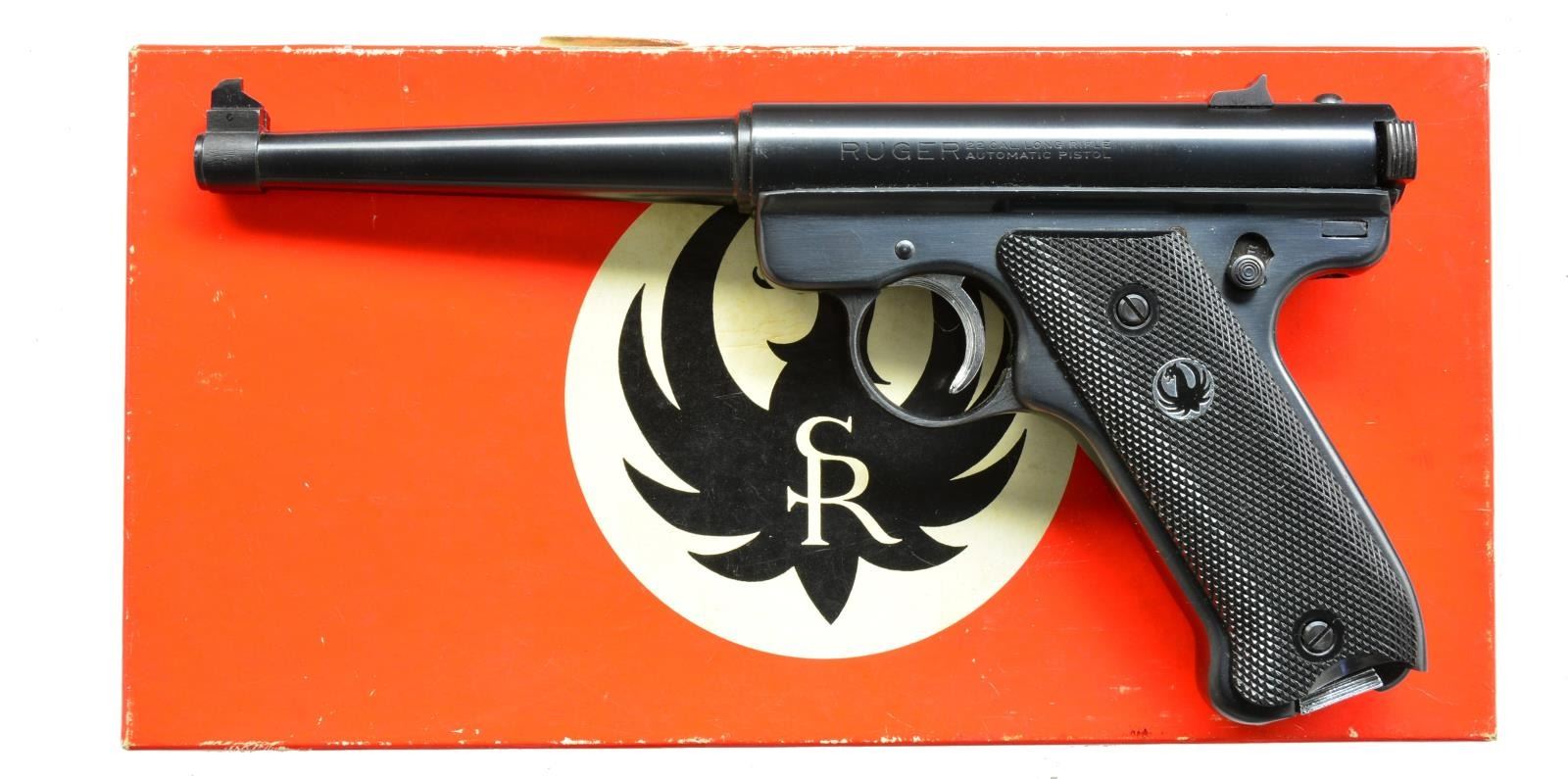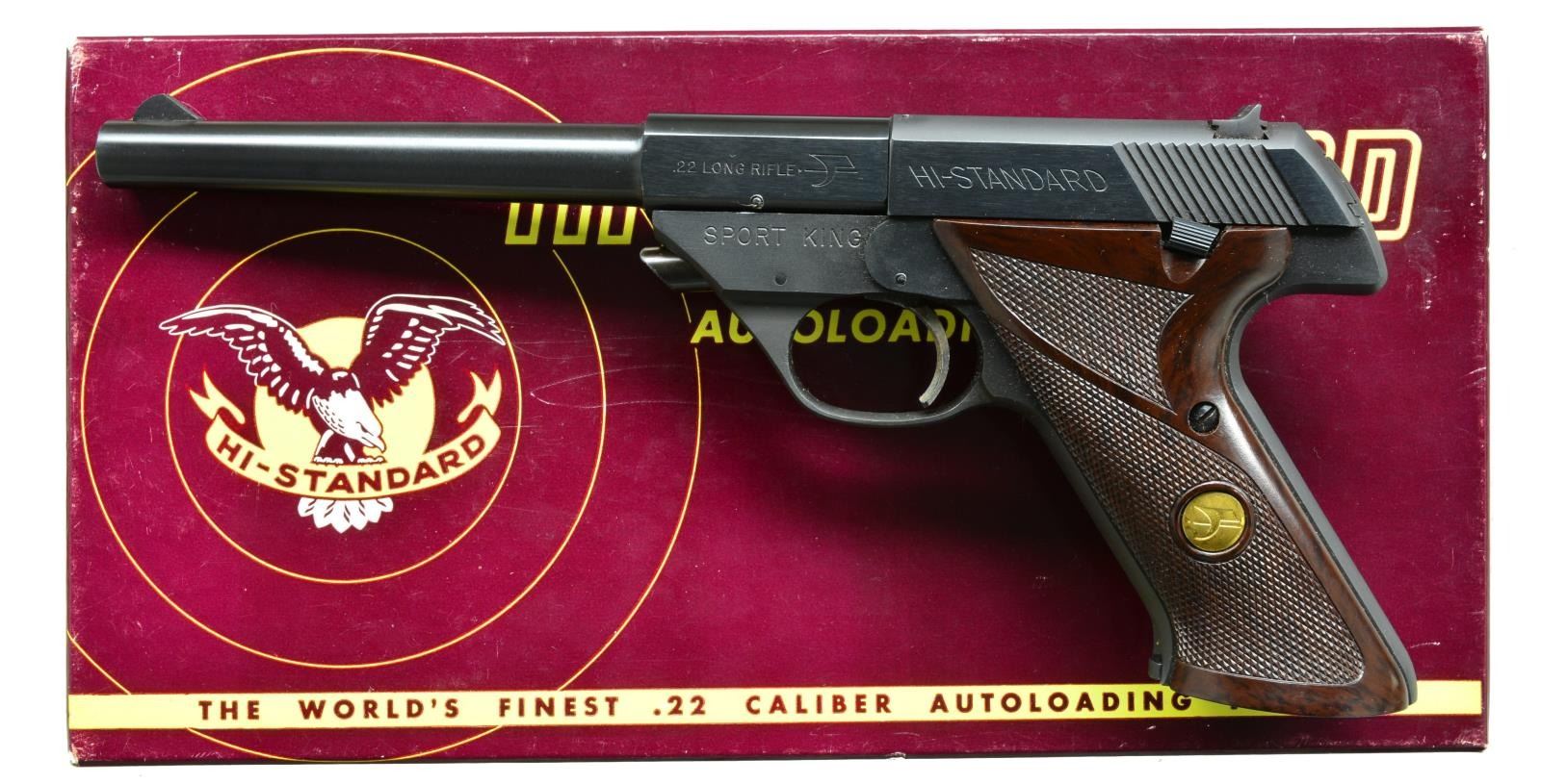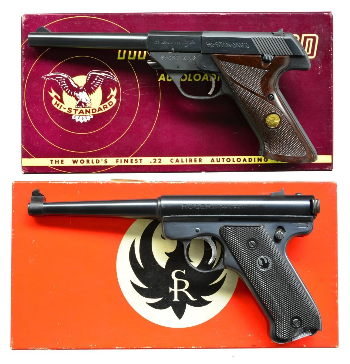 1) HI STANDARD MODEL 103 SPORTKING. Cal. 22 LR. S# 1846766. Bbl. 6 3/4". Satin blue finished bbl. & slide. Matte finished frame. Matching numbers on frame & slide. Factory brown plastic grips w/ gold medallions. Fixed blade front sight. Drift adjustable rear sight. Push button quick change bbl system. MAGS: 1 factory 10 rd. UNATTACHED ACCESSORIES: original factory cardboard box & literature. CONDITION: while the majority of exposed metal surfaces retain factory finish there are a few spots of oxidation that appear to have been brought under control. Fire control group appears to function properly when cycled by hand. Shiny bore w/ good rifling. (20-4118/JZ). MODERN. 2) RUGER STANDARD AUTO. Cal. 22 LR. S# 472539. Bbl. 6". Blued finish on exposed metal surfaces. Black plastic factory grips. Left side emblemized w/ Ruger medallion. 1968 Mfg. Fixed blade front sight. Drift adjustable rear sight. MAGS: 2-10 rd. UNATTACHED ACCESSORIES: original factory box. CONDITION: exposed metal surfaces enjoy complete coverage of original factory finish. Gentle thinning in areas of mechanical intervention. Shiny bore. Fire control mechanism appears to function correctly when cycled by hand. (20-4120/JZ). CURIO. $500-900.