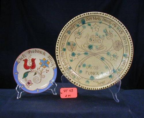 2 AMISH MOTTOWARE CHARGERS (1) 12in REPRODUCTION OF IACOB FUNCK C.1804 1991 MFG. BY WISCONSIN POTTERY CO., (1) 7in CHARGER BUDINHAD PA. 1980 ARTIST SIGNED GRETH, 2 PC