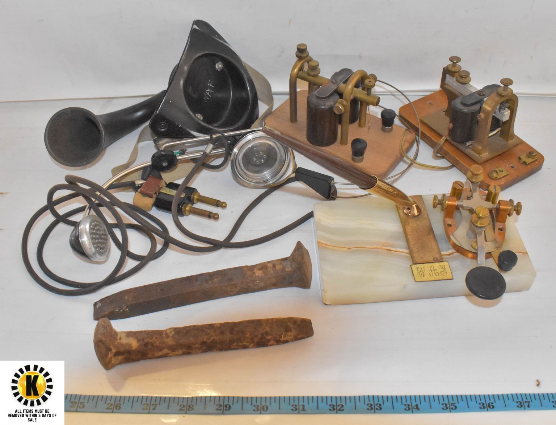 2 ANTIQUE RAILWAY TELEGRAPHS WITH HEADSET, DESK