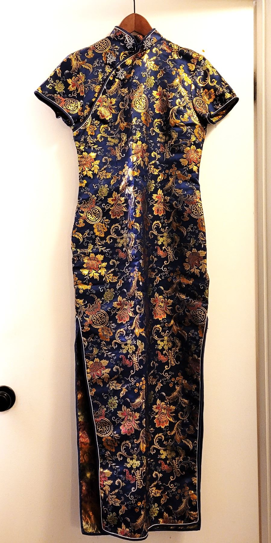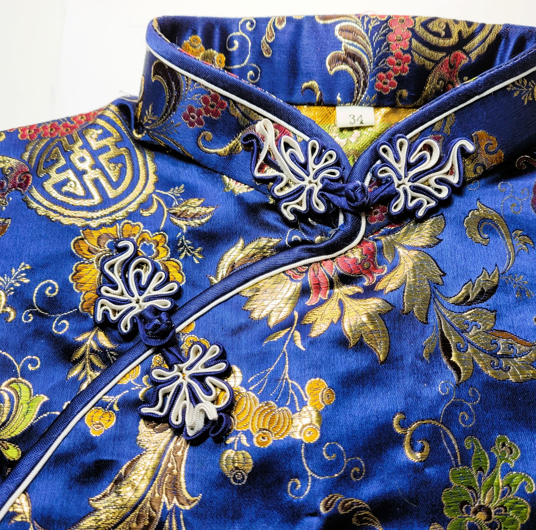 DRESS IN NAVY BLUE WITH GOLD METALLIC THREAD AND MANY COLORS, TRADITIONAL FROG CLOSURE, SIZE 34 (XS). CLOTHING