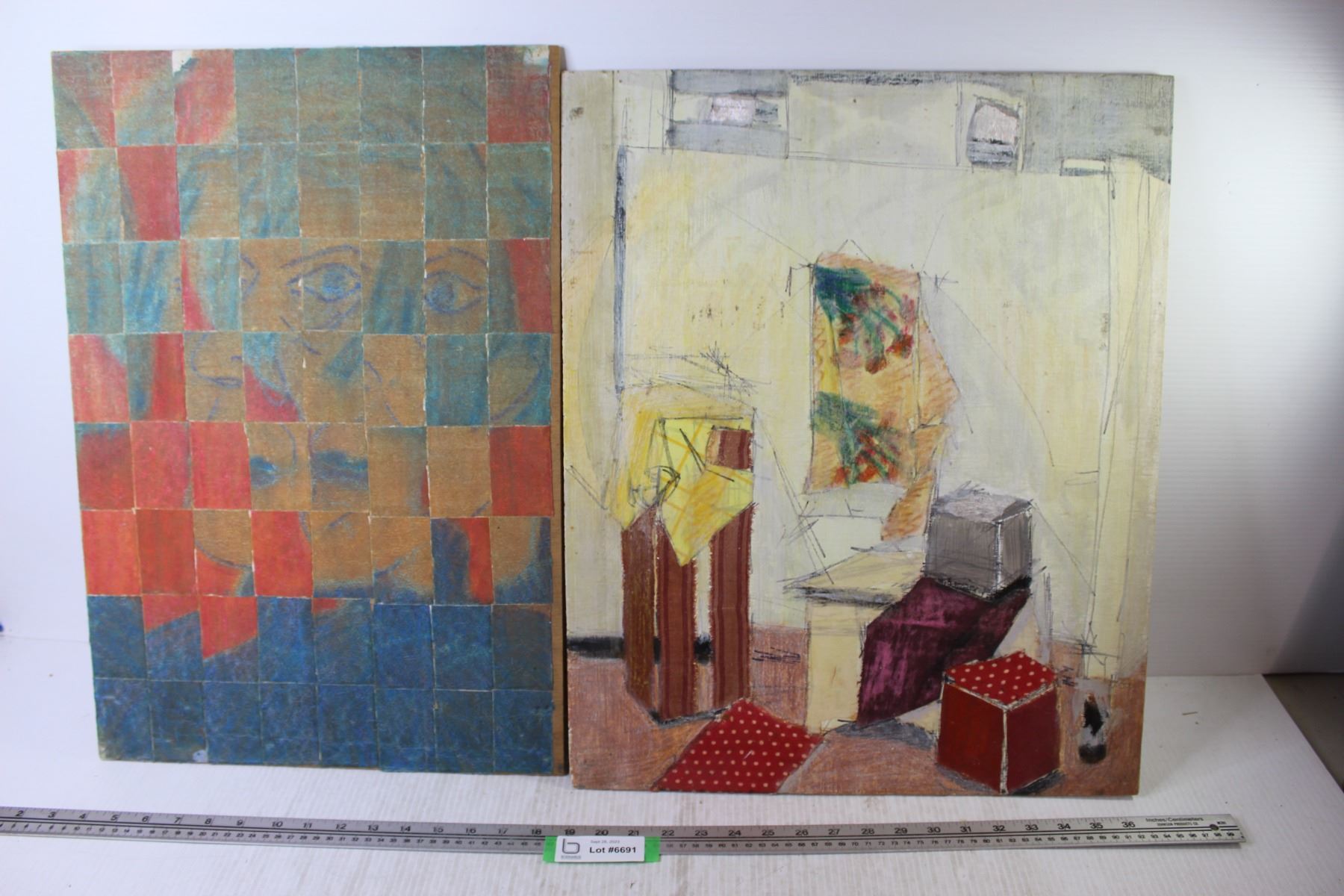 (2) Abstract Paintings on Wood Paneling (18" x 22") (15 1/2" x 22 1/2")