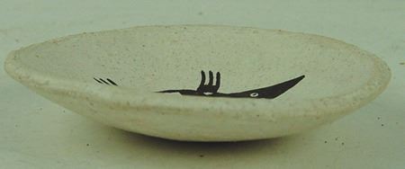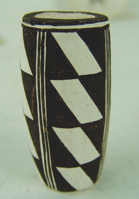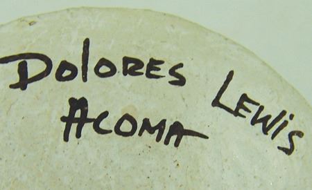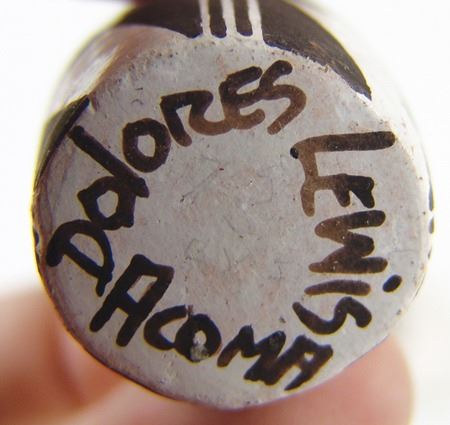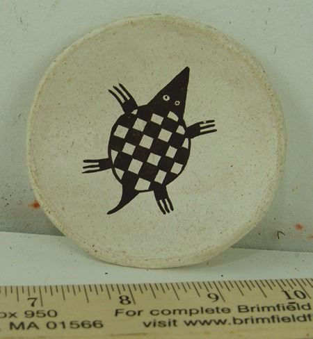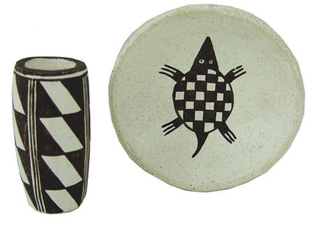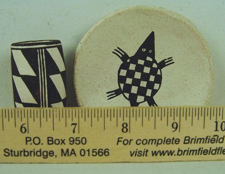 Ca. 1980s, Pair of miniature black-on-white pottery vessels including a tall vase and a turtle plate. Both in very good condition. Dolores is one of Lucy's daughters. Vase 2-1/2" x 1-1/8", dish 3-1/4"