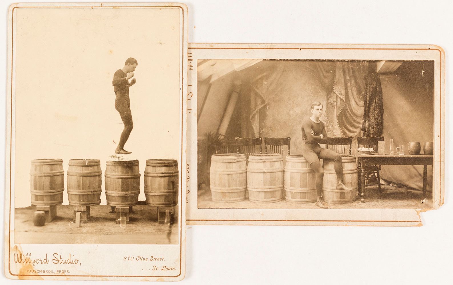 An acrobat sitting on 4 wooden barrels ( 2 lower corners missing) and then jumping on a barrel(some staining and tape residue on rear). By Willyerd Studios. Date: Location: HWAC # 53268