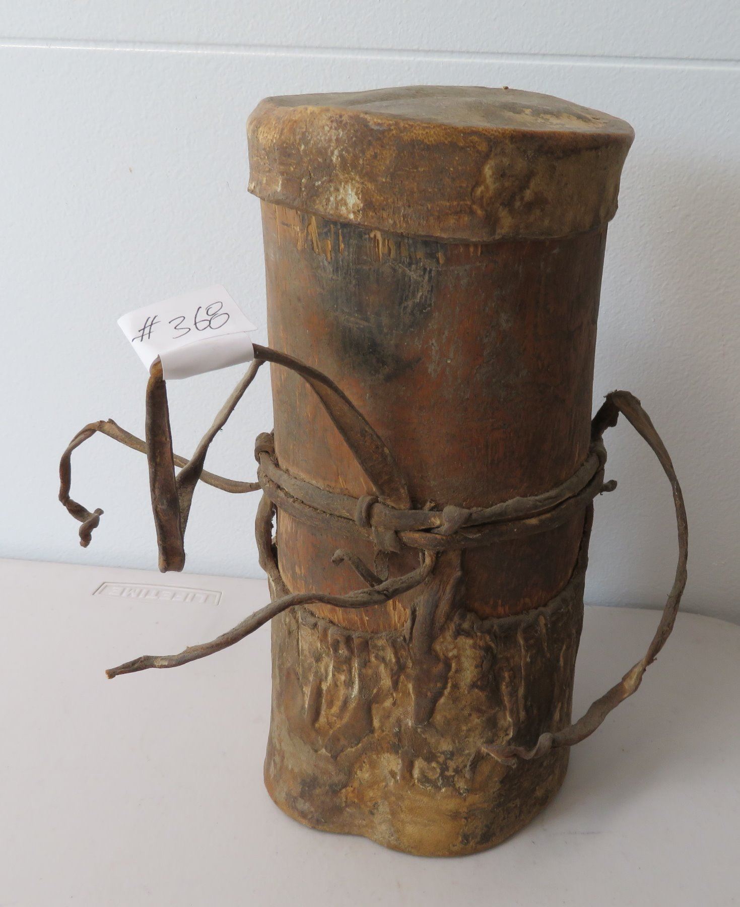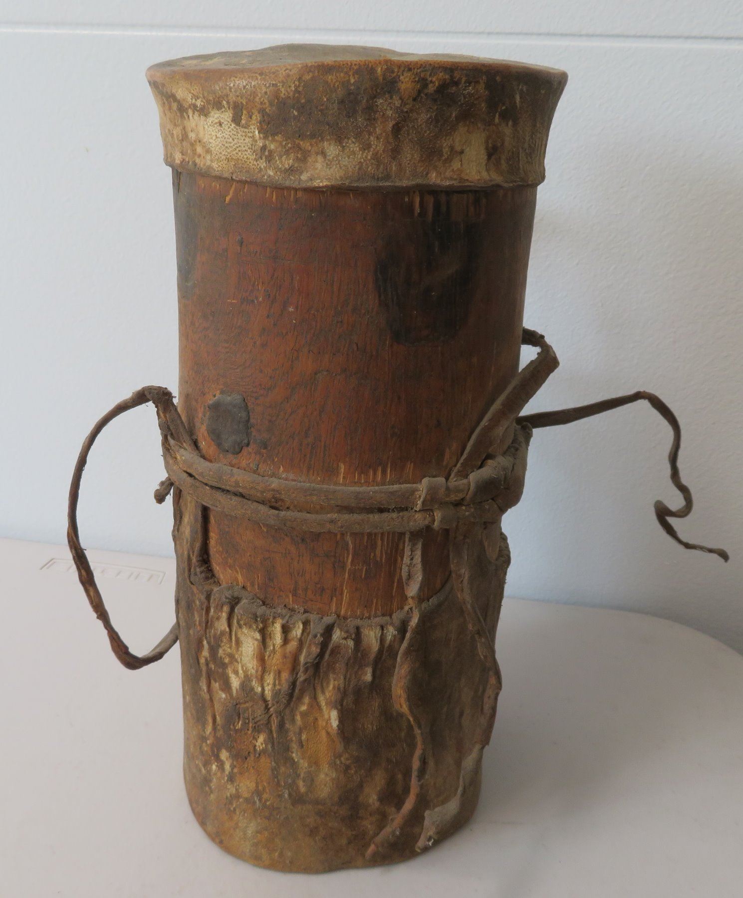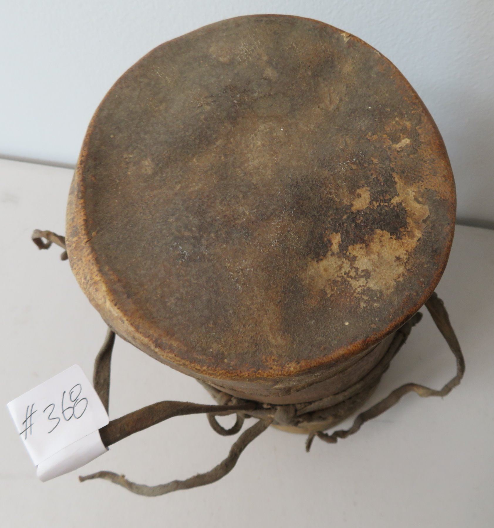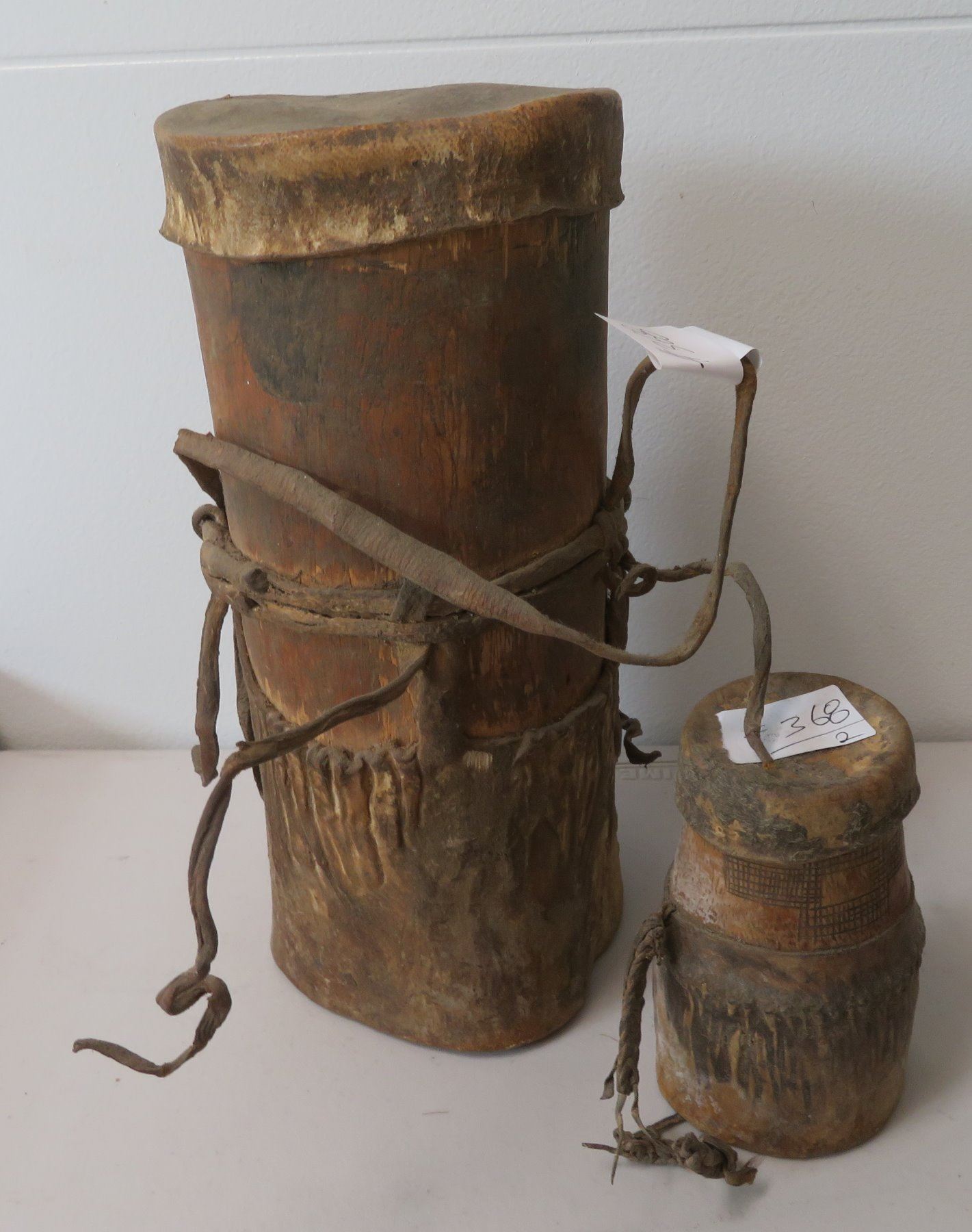 2 African Drums, c. 1940s. Made of wood and cowhide, the largest measures 11 1/2" x 5". Possibly Congo. Some engraving. Condition: Wear and minor damage, see images. Shipping: $30.00 w/insurance and signature, due to size.