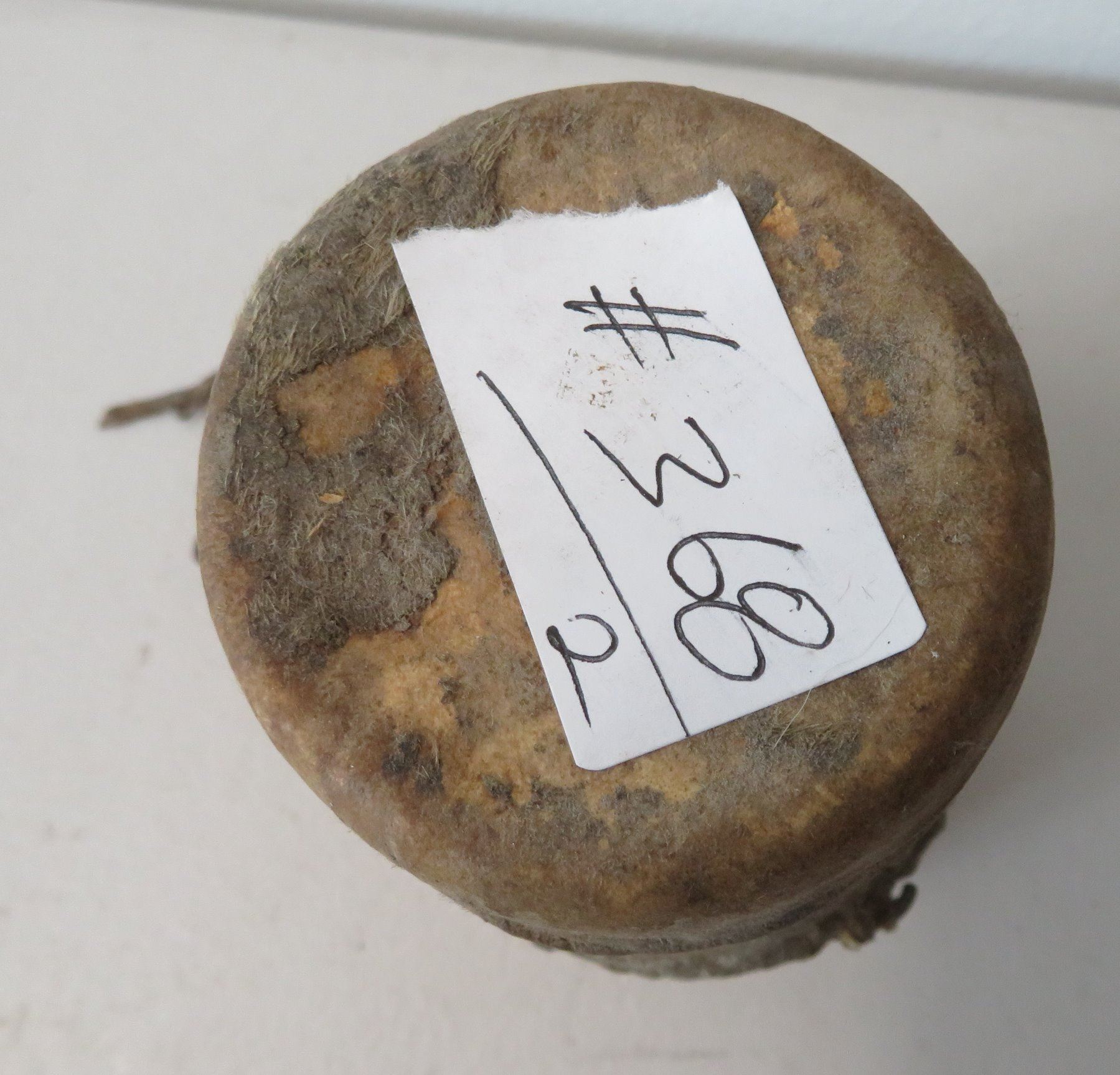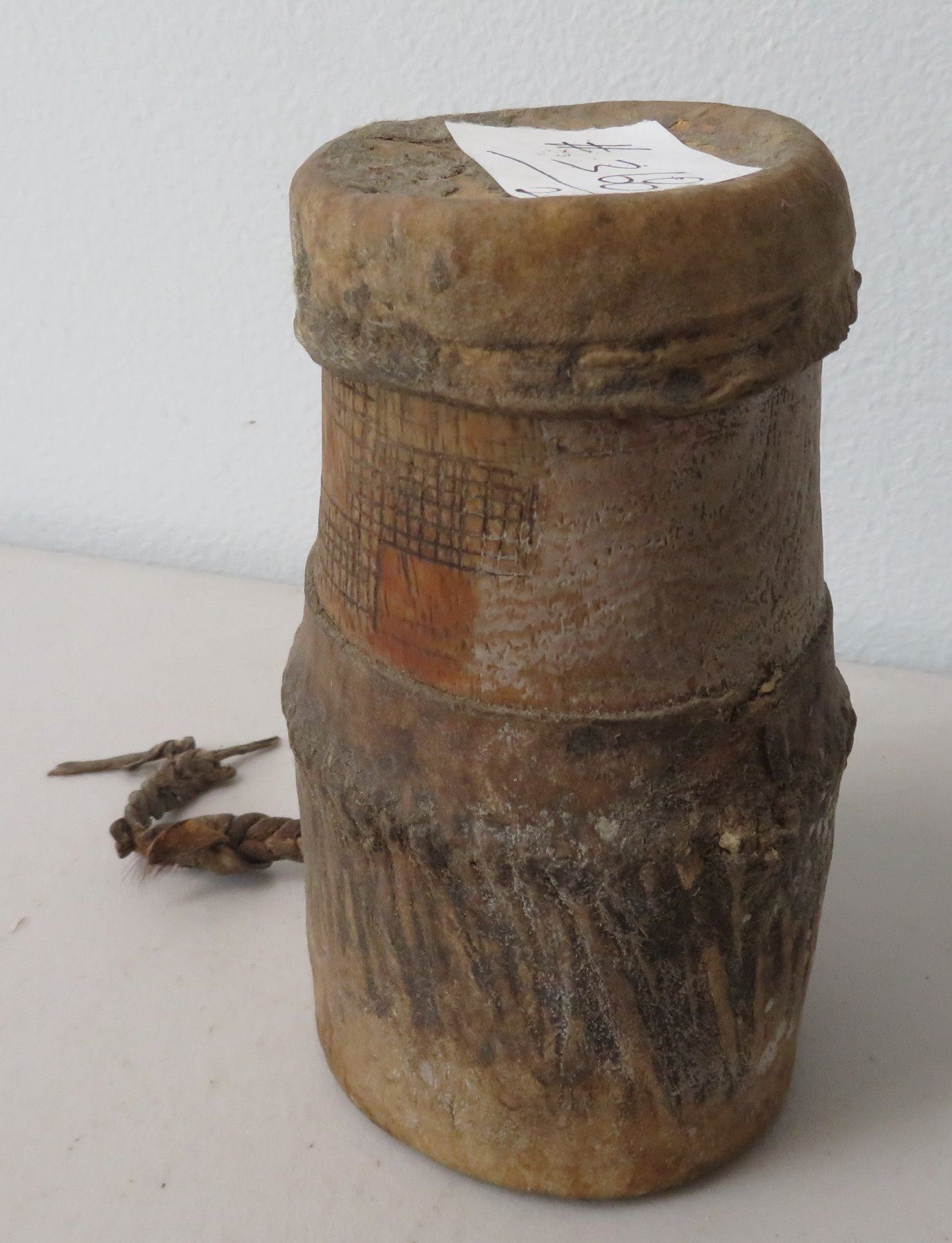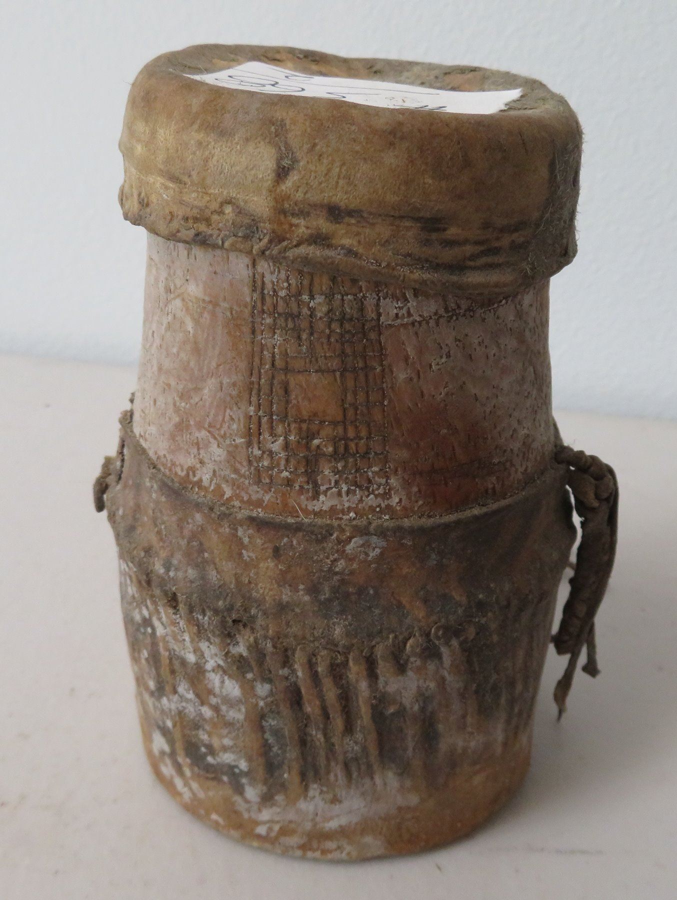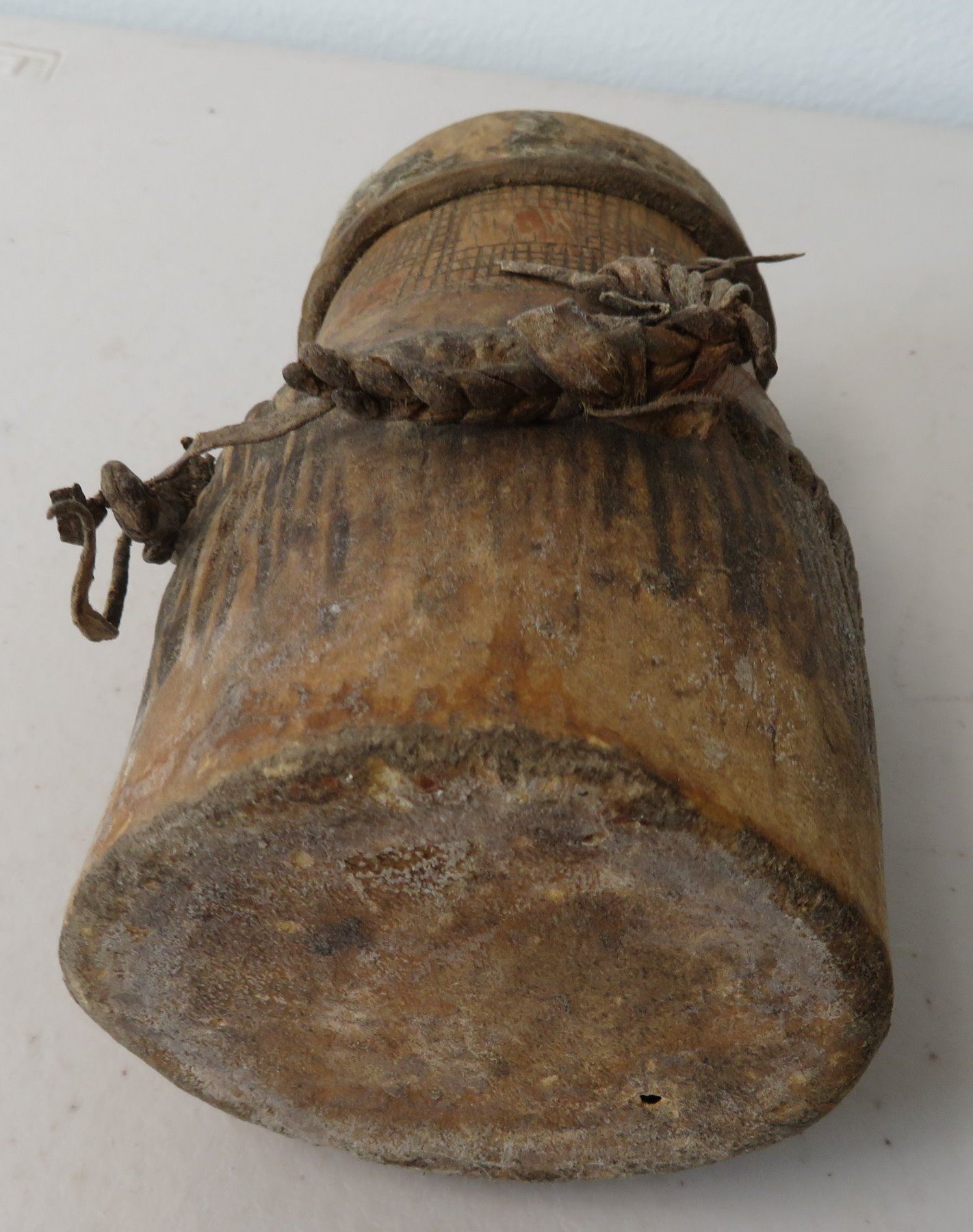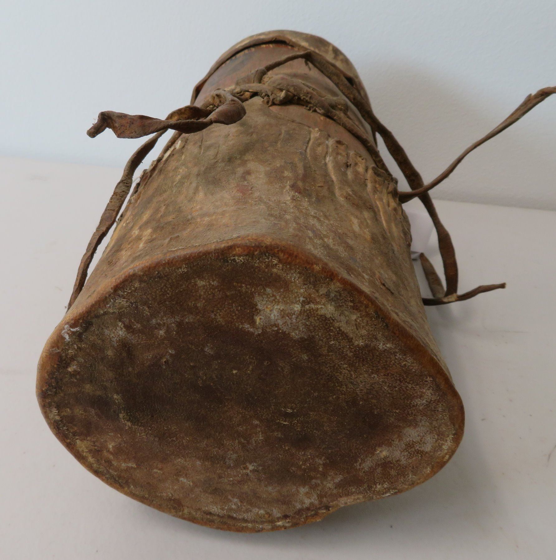 2 African Drums, c. 1940s. Made of wood and cowhide, the largest measures 11 1/2" x 5". Possibly Congo. Some engraving. Condition: Wear and minor damage, see images. Shipping: $30.00 w/insurance and signature, due to size.
