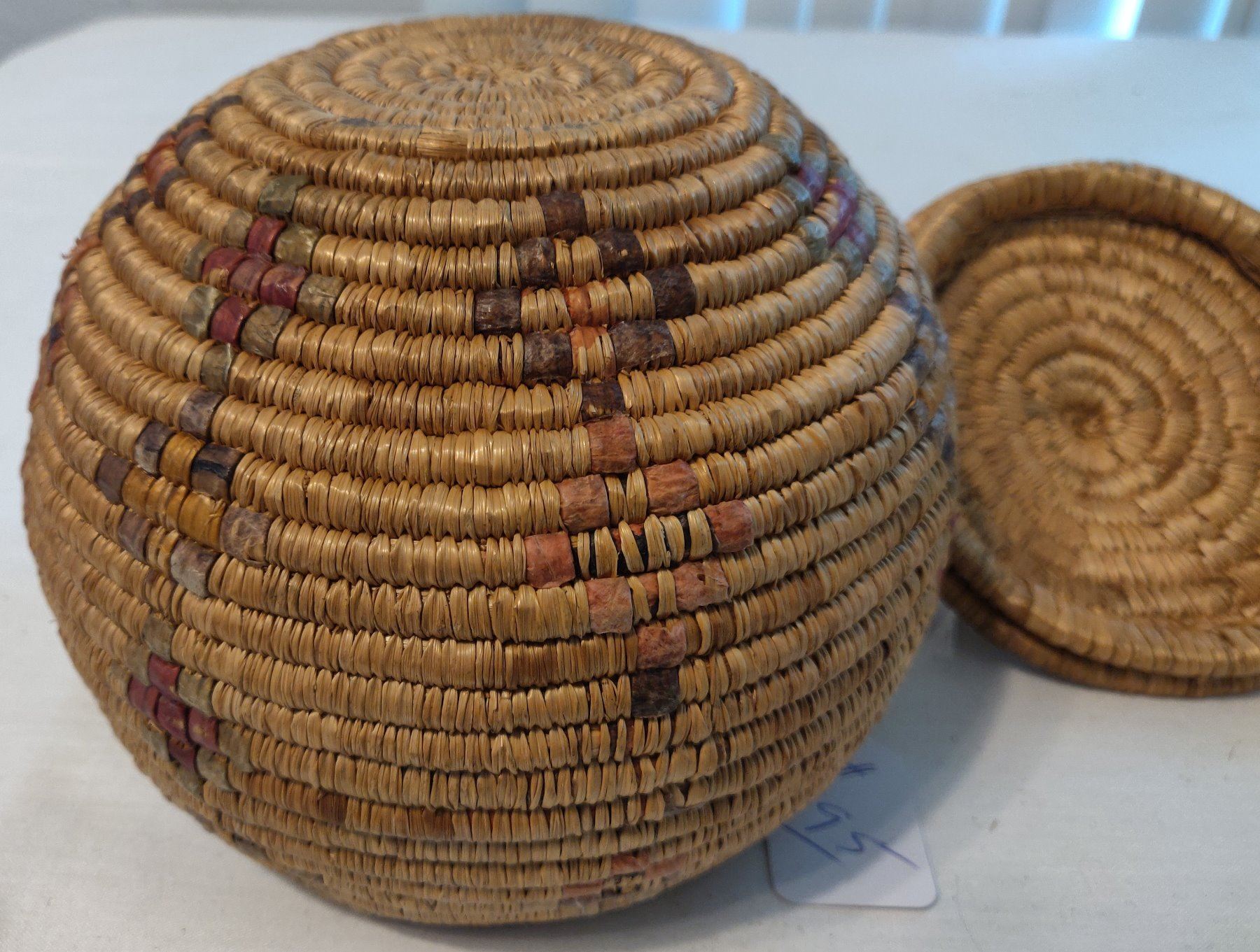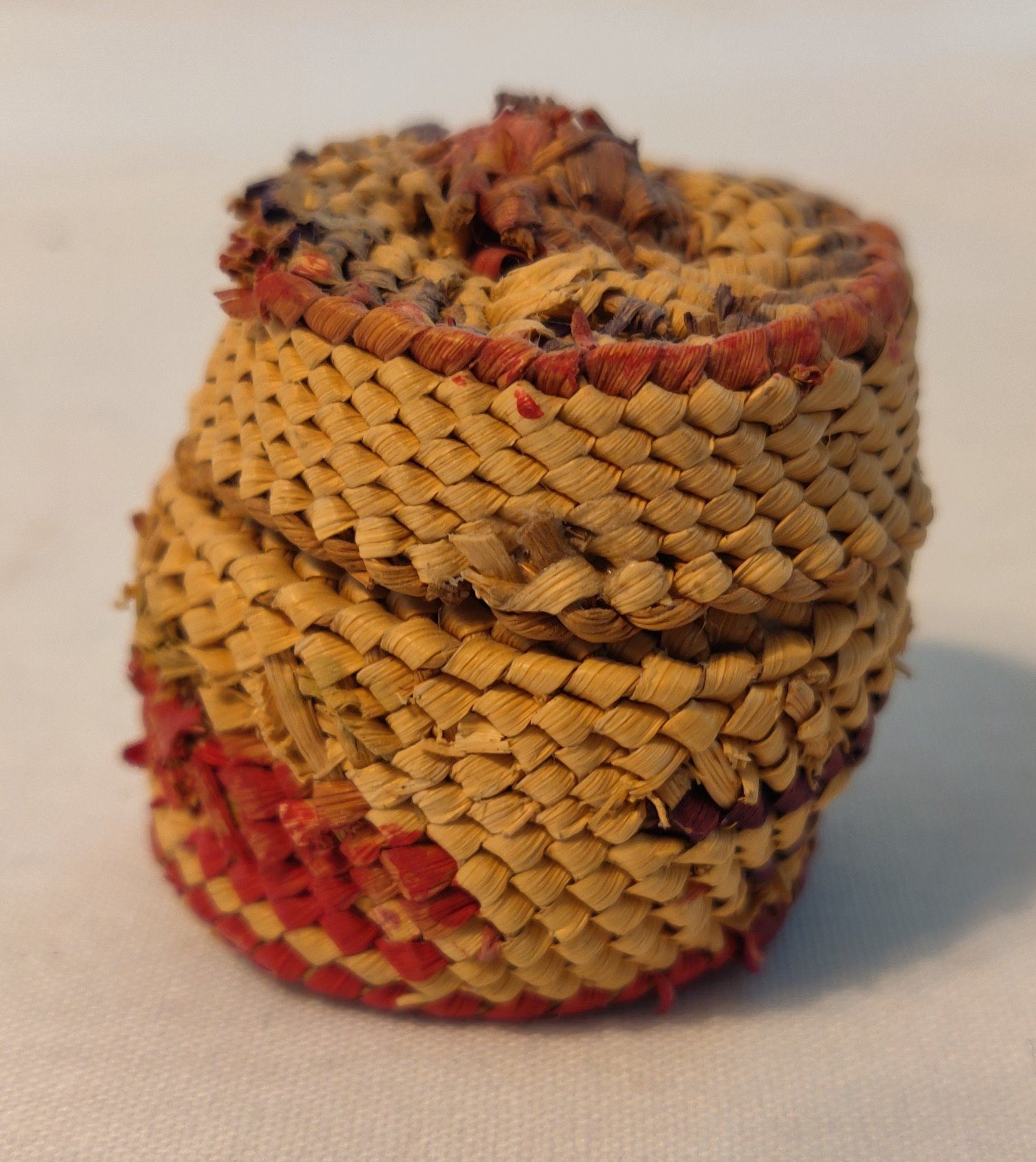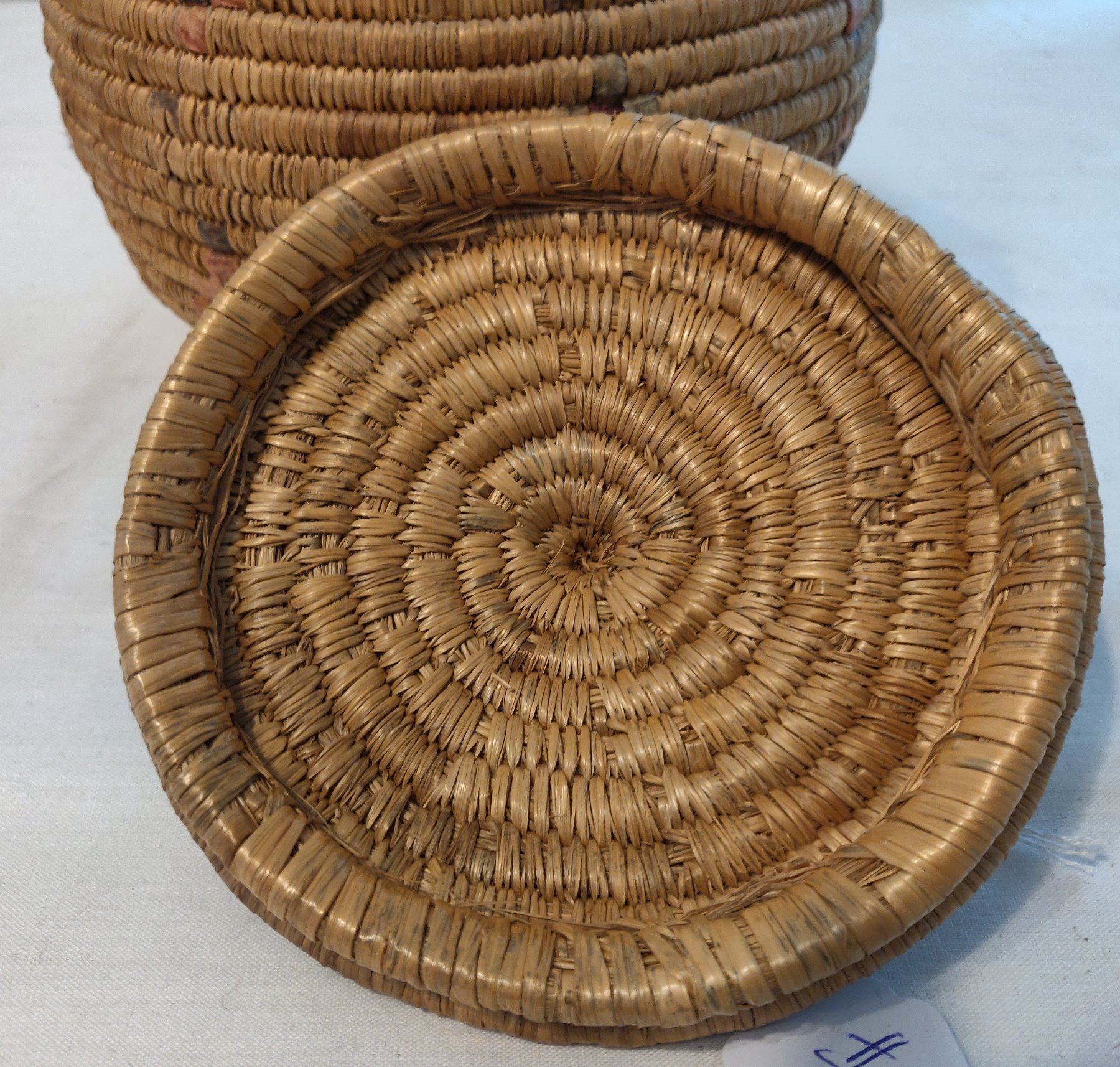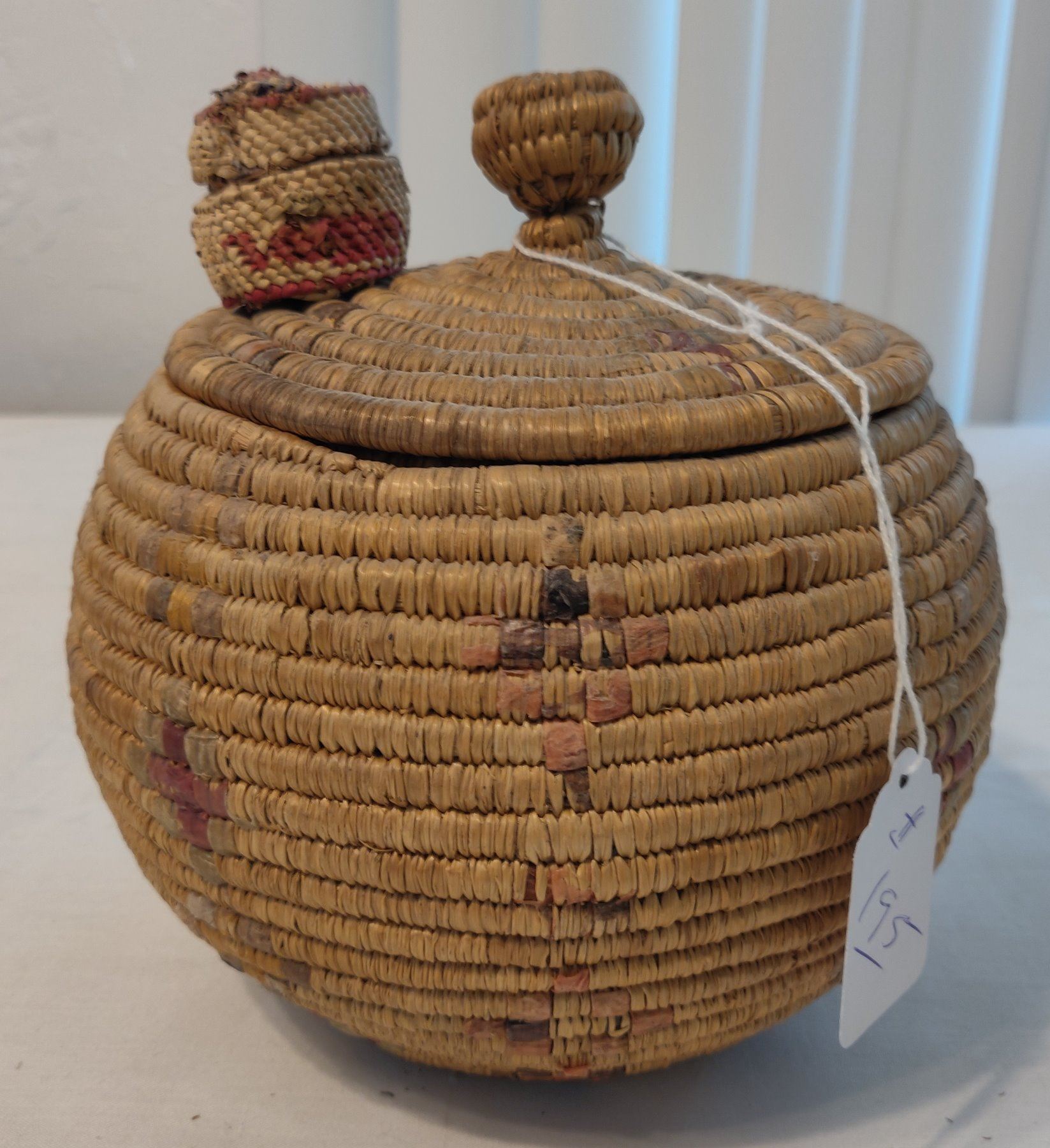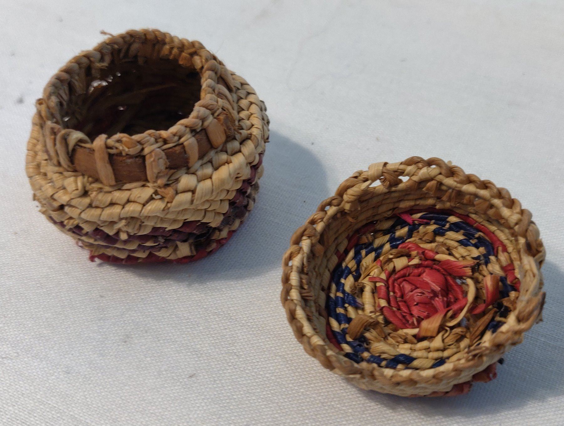 2 Alaskan Baskets, c. 1930s. Made of grass, the large item measures 6" x 6", smaller basket is about 1". Alaskan. Condition: Faded, see images. Shipping: $20.00 w/insurance and signature, due to value.