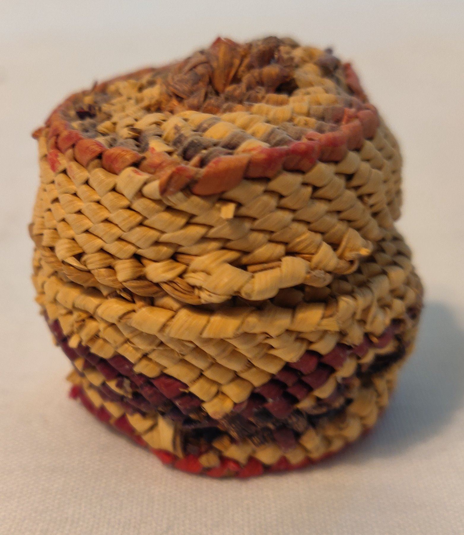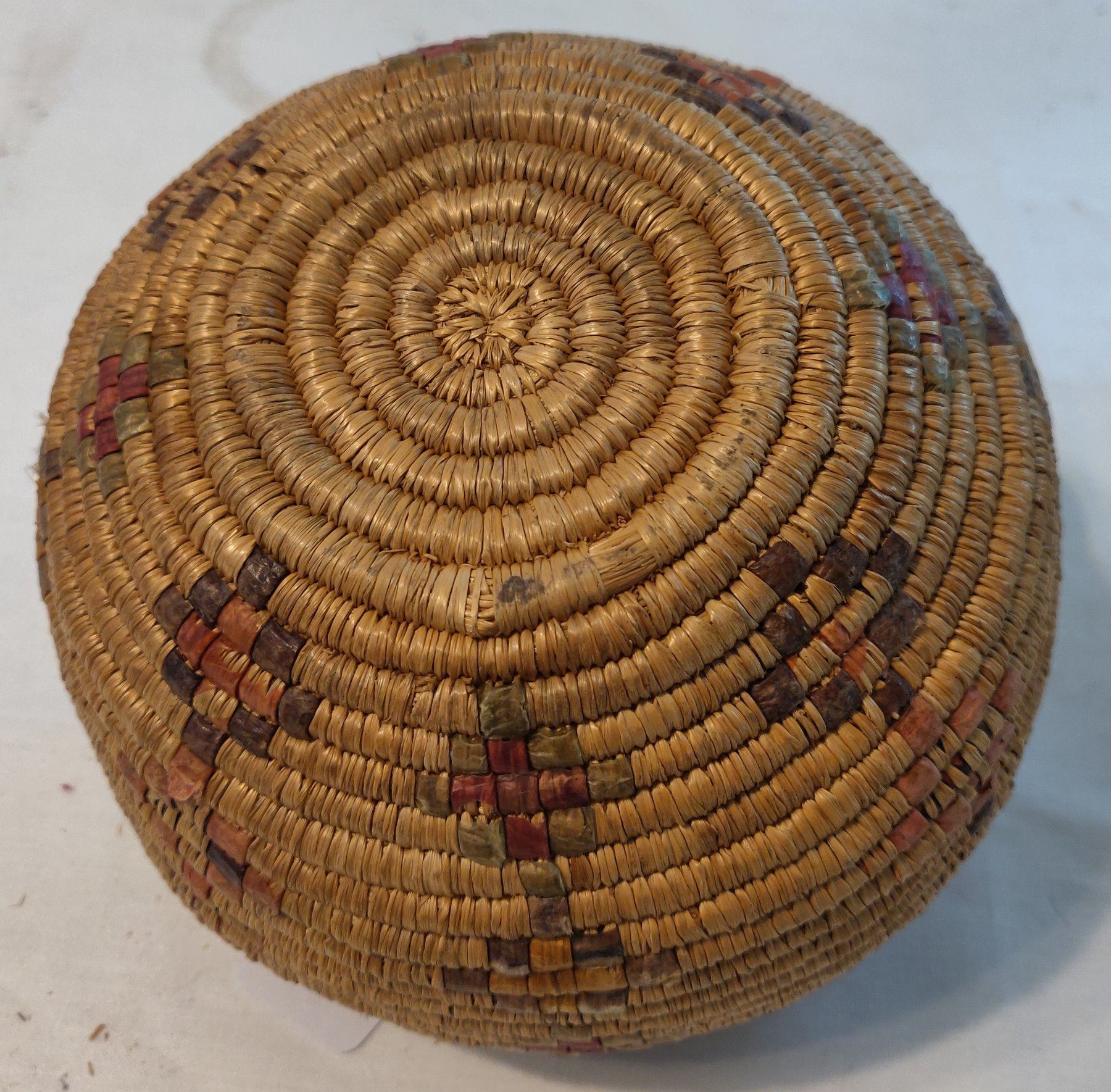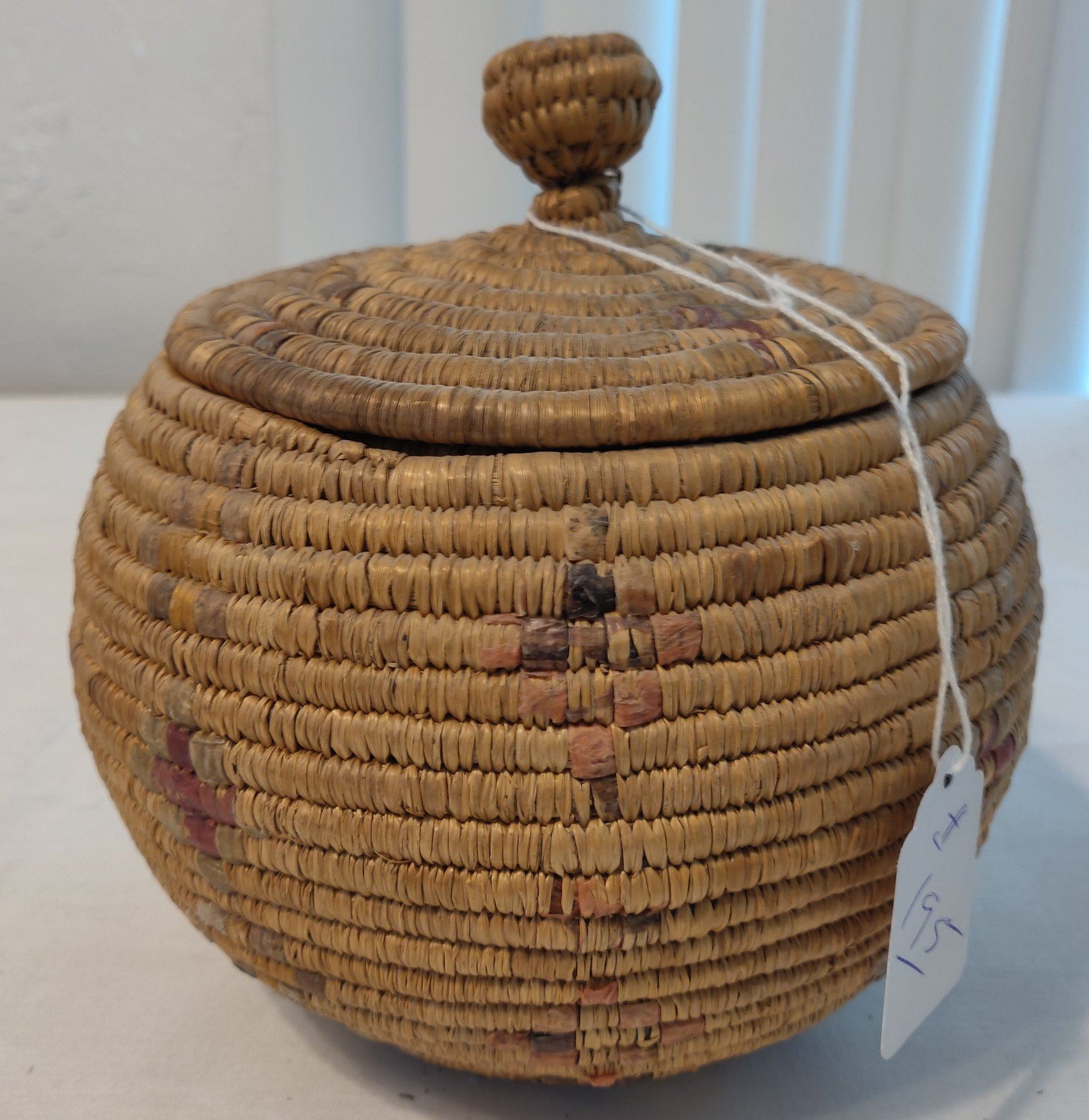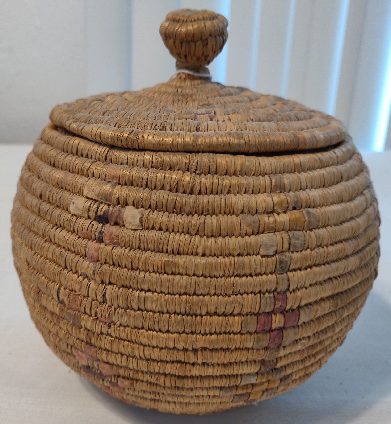2 Alaskan Baskets, c. 1930s. Made of grass, the large item measures 6" x 6", smaller basket is about 1". Alaskan. Condition: Faded, see images. Shipping: $20.00 w/insurance and signature, due to value.