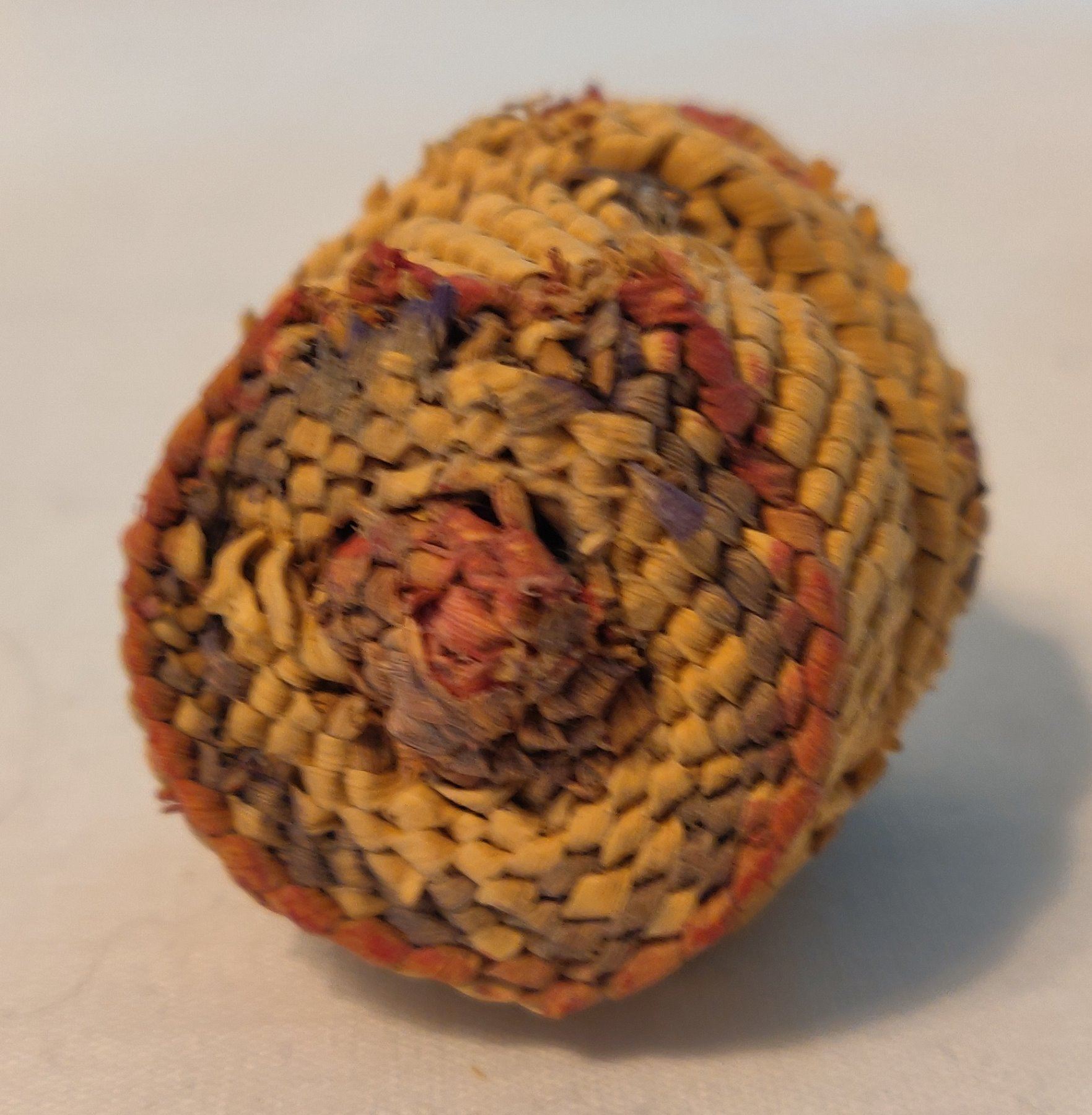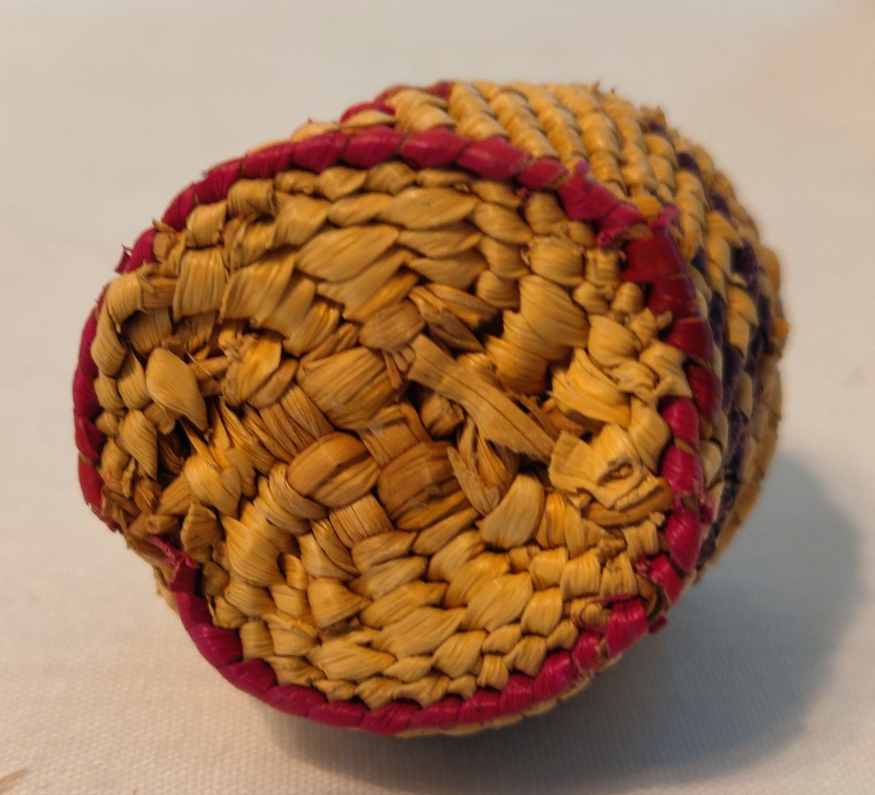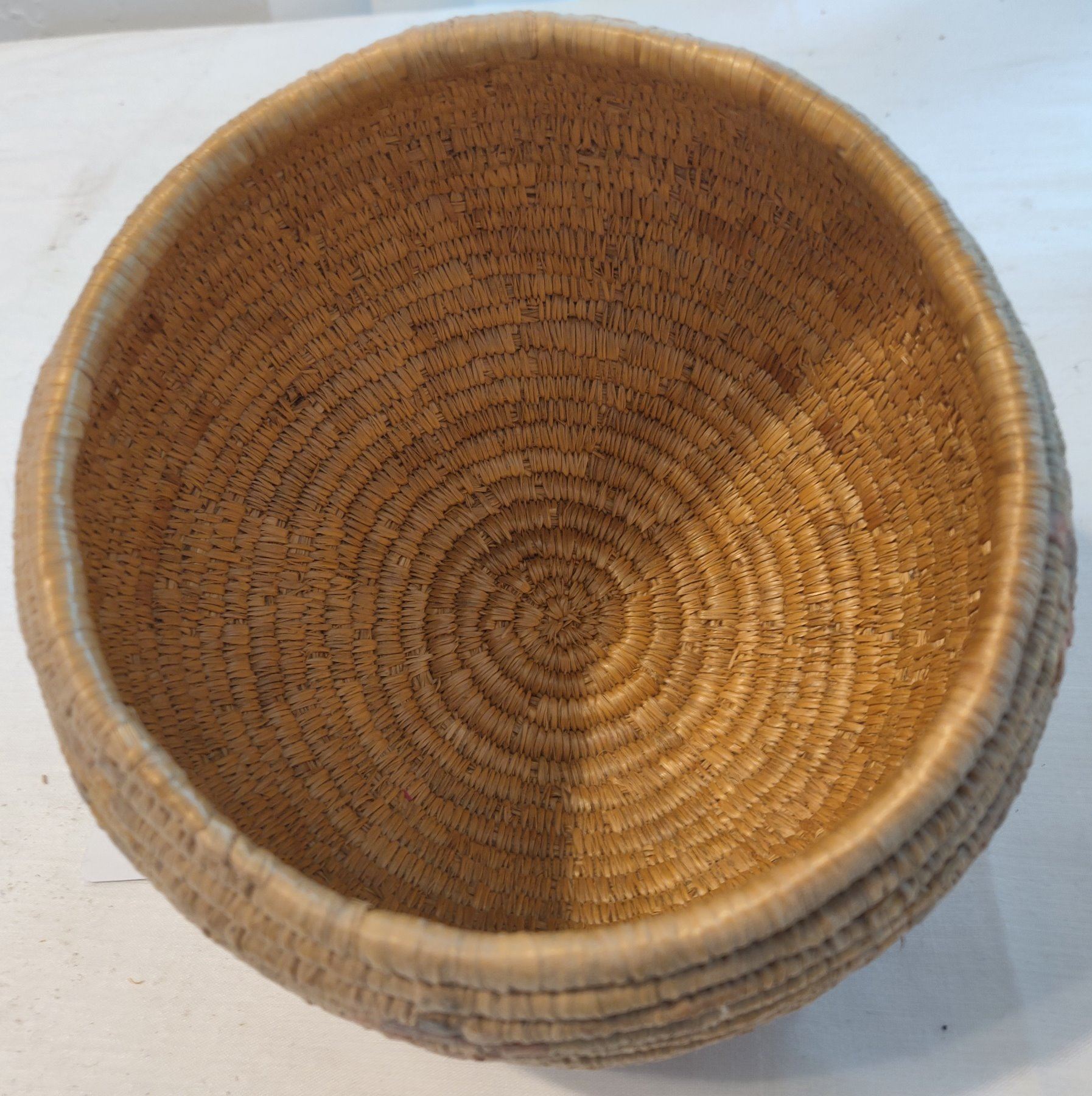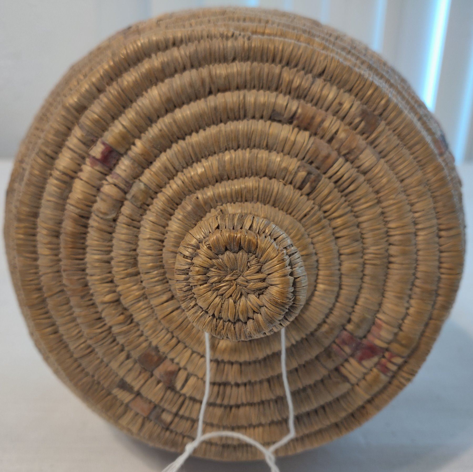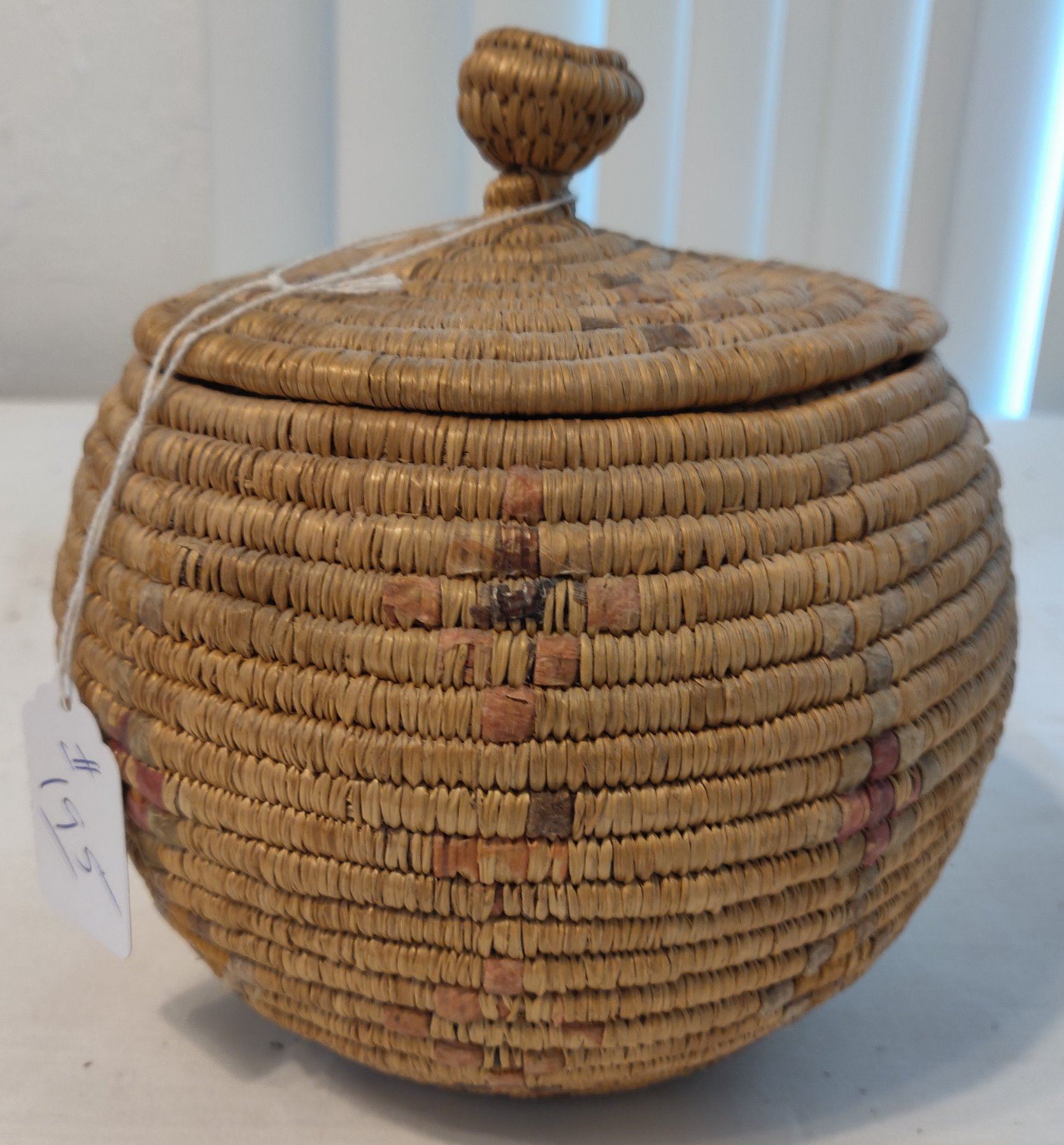 2 Alaskan Baskets, c. 1930s. Made of grass, the large item measures 6" x 6", smaller basket is about 1". Alaskan. Condition: Faded, see images. Shipping: $20.00 w/insurance and signature, due to value.