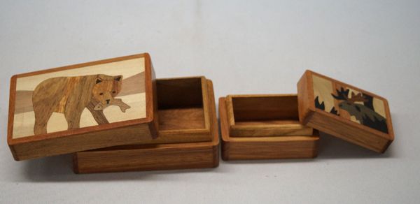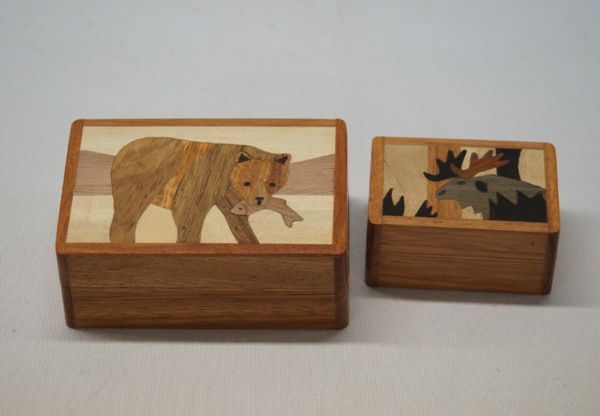 2 Wooden Marquetry Trinket Boxes, largest box measures 2.5'' x 1''H. Wood inlay Moose & Bear with Fish. Marquetry wooden art is done with several different colors of wood. Made in the Philippines.