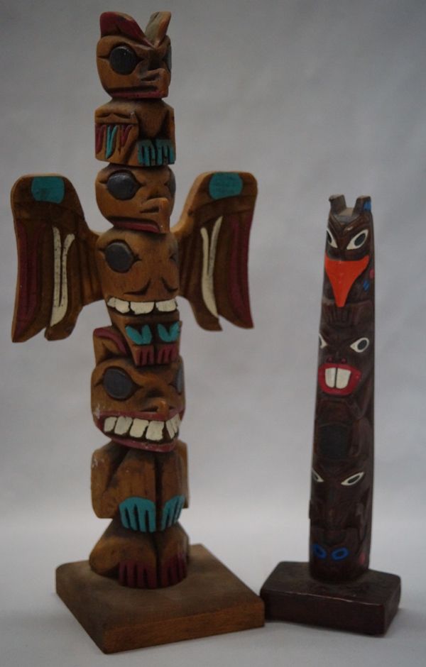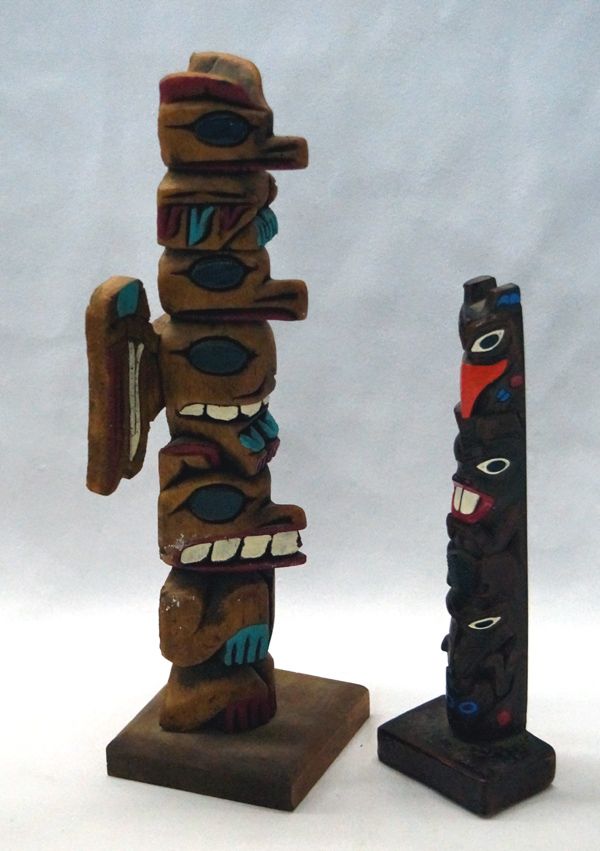 2 Alaskan Trading Post Wooden Totem Poles. 13'' high X 5'' wide. The different animal figures such as thunderbird, beaver, bear, and whale are on the poles to depict a story. The totems are regarded by the Indians with respect and as guide to the stranger within the gate.