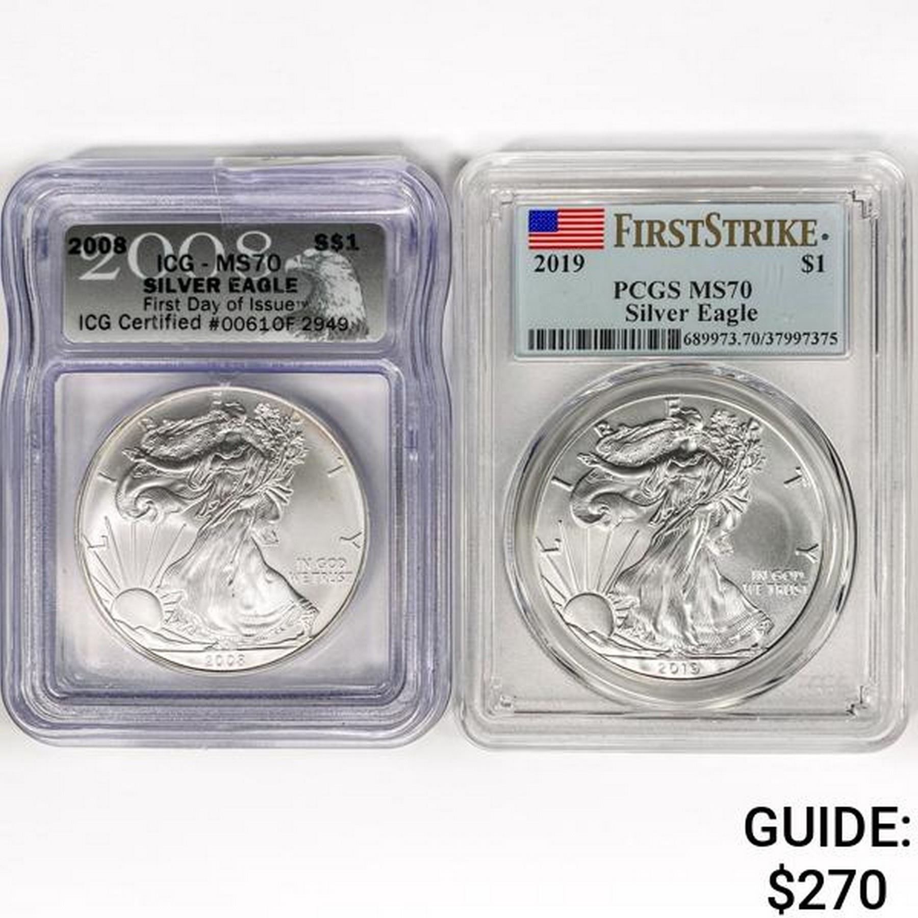 (2) American Silver Eagle ICG,PCGS MS70
