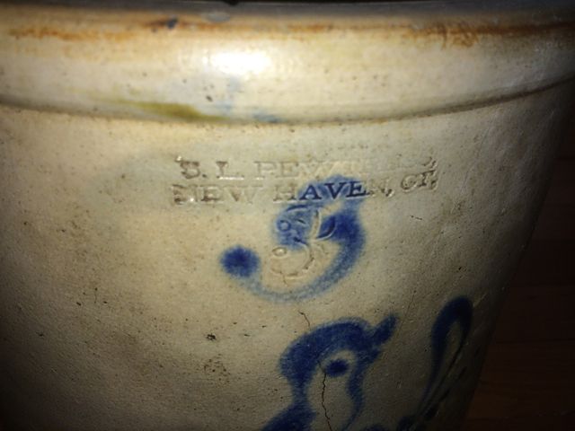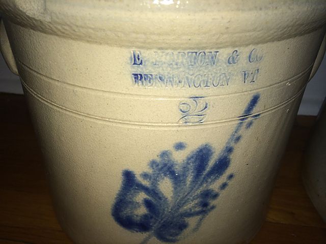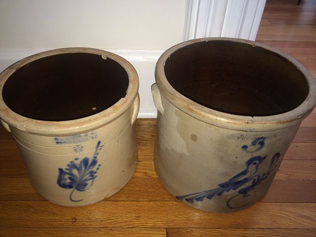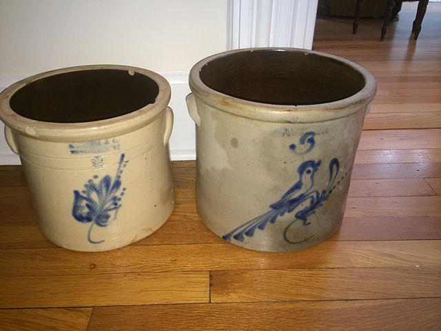 American Stoneware E. Norton & Co. Bennington, VT #2 crock and 3 gallon crock by S.L. Pewtress, N.H.; blue bird, recto measures 10" high, has small crack.