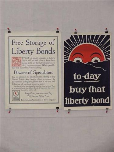 (2) American WWI Posters, "Free Storage of Liberty Bonds etc. Beware of Speculators etc.", Artist-Not Provided, Printer-Not Provided, 22" x 16", Condition – Good: Border Tear to Upper Right Side; Together w/ "To-Day Buy That Liberty Bond", Artist-Not Provided, Printer-Not Provided, 22" x 14", Condition – Poor: Large Loss to Upper Left Corner, Creasing,