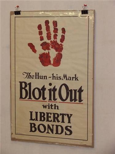 2 American WWI Posters, "The Hun – His Mark – Blot it Out With Liberty Bonds", Artist-J. Allen Sr. John, Printer-Manz Engraving Co.-Chi.(Small); Brett Litho. Co.-NY (Large), 30" x 20"(Small); 42 1/4" x 27 3/4" (Large), Condition – Fair: Border Tears (Up to 4") w/ Breakaway Tears and Corner Chipping, Corner and Compression Creases, Soiling, Staining; Small Poster w/ 1 1/2" Chip Loss on Left Side,