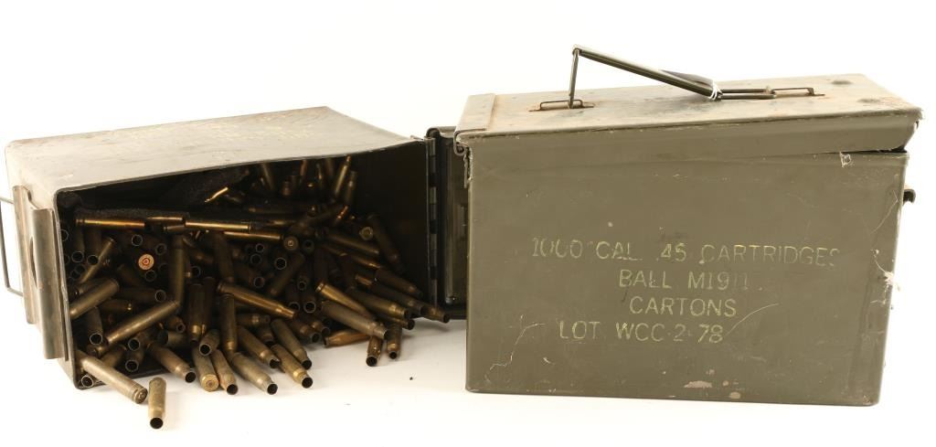 1 can is half full of 30-06 Springfield brass and the other is empty.