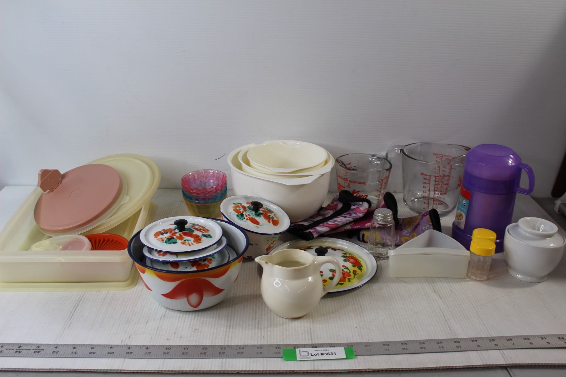 (2) Anchor Hocking Fire King Measuring Cup, (3) Plastic Mixing Bowls, Tupperware Tray, Tupperware Lids, Salt and Pepper Shakers, Assorted Kitchen Items