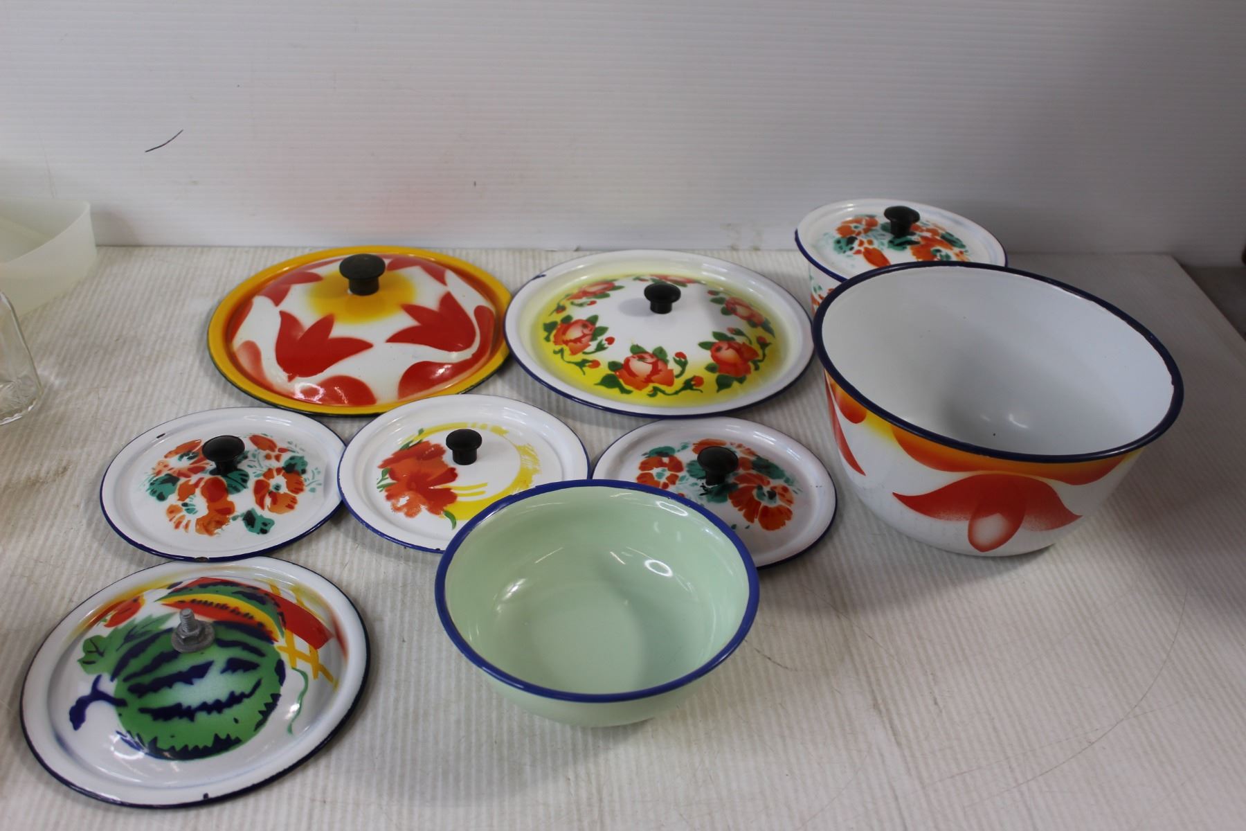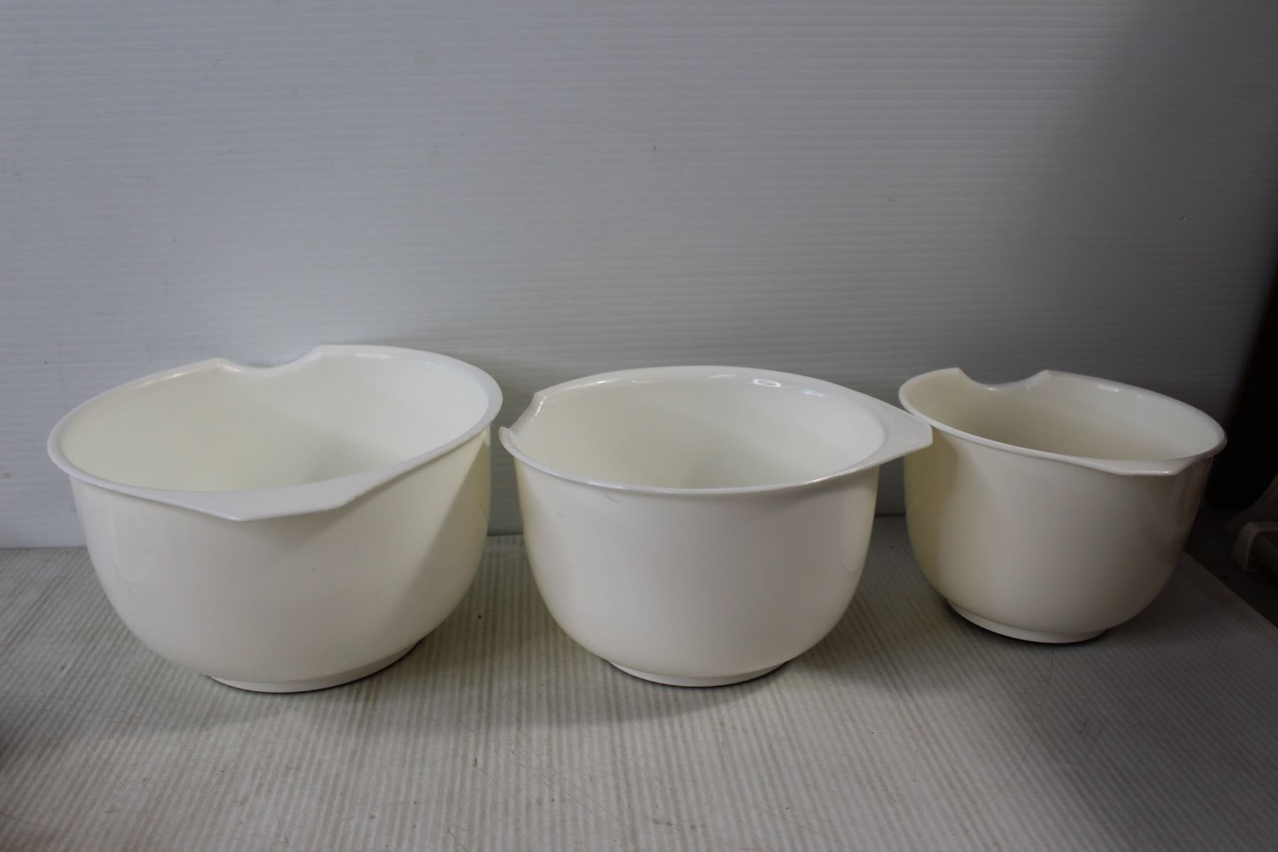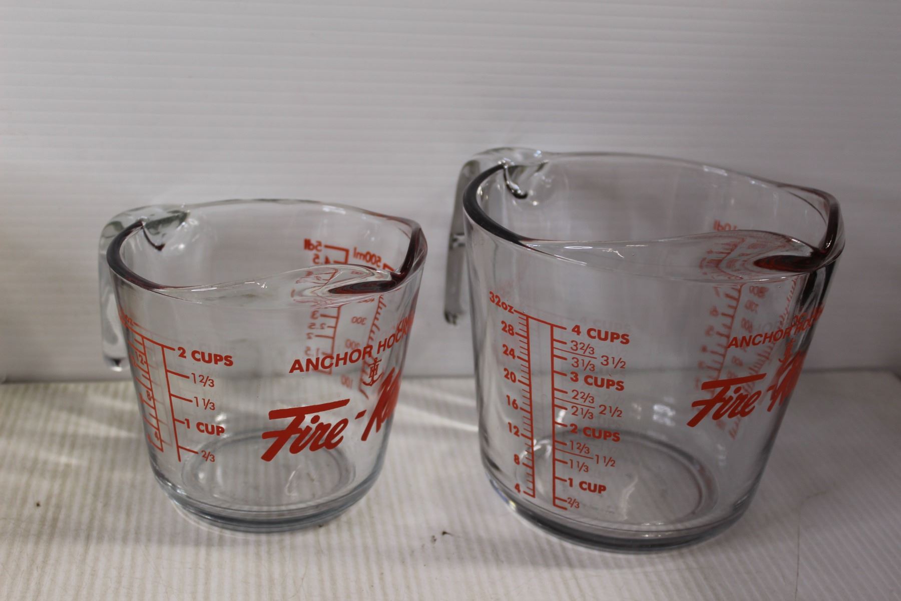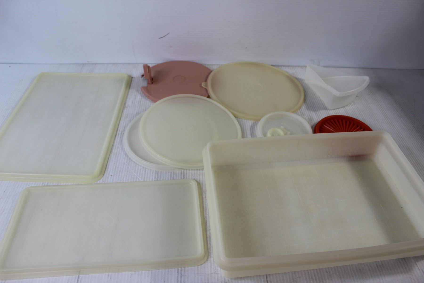 (2) Anchor Hocking Fire King Measuring Cup, (3) Plastic Mixing Bowls, Tupperware Tray, Tupperware Li