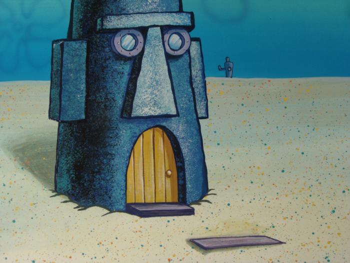 This original hand-painted background from the Nickelodeon TV show SpongeBob Squarepants. The story takes place under the deep blue sea in Bikini Bottom, where SpongeBob resides. SpongeBob, who is a yellow, porous sponge, is your typical happy-go-lucky character, as he is always cheerful and enjoys making people laugh. Patrick Star, SpongeBob's neighbor who is a starfish, is your average children's show idiot, as he boasts knowing nothing and is often getting himself into ridiculous situations. Between the homes of these two lies the home of the miserable Squidward, a squid, who is known for being grouchy and playing tricks on SpongeBob and Patrick. Both SpongeBob and Squidward work at the Krusty Krab, a fast food business run by the greedy money-loving Mr. Krabs, a crab, the arch rival of the evil, possibly misunderstood, Plankton. Another neighbor, Sandy Cheeks, an athletic squirrel who normally wears an astronaut's space suit, was introduced in "Tea at the Treedome." She spends most of her time inventing and experimenting. Original Production Background Overall Size of Background: 10 1/2" x 14" Very good condition; it has been stored Original Production Backgrounds are used in the making of the final version of animated productions. The background establishes the location and the overall good mood of the scene. Typically, a background layout artist creates a drawing to establish the content of the scene, placement of characters, perspective and camera angle. Based on this drawing, the background artist creates a preliminary painting to confirm all of the scenes details, then the final production background which is used in the filming of the scene. When these backgrounds are individually photographed behind the progression of production cels, and projected at a rapid succession, the images in the foreground appear to move, creating an animated scene. The background is ready to be matted and framed. It is a colored background with the animator's notations at the bottom.
