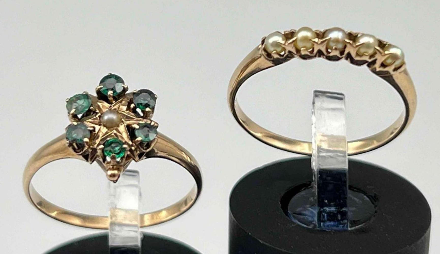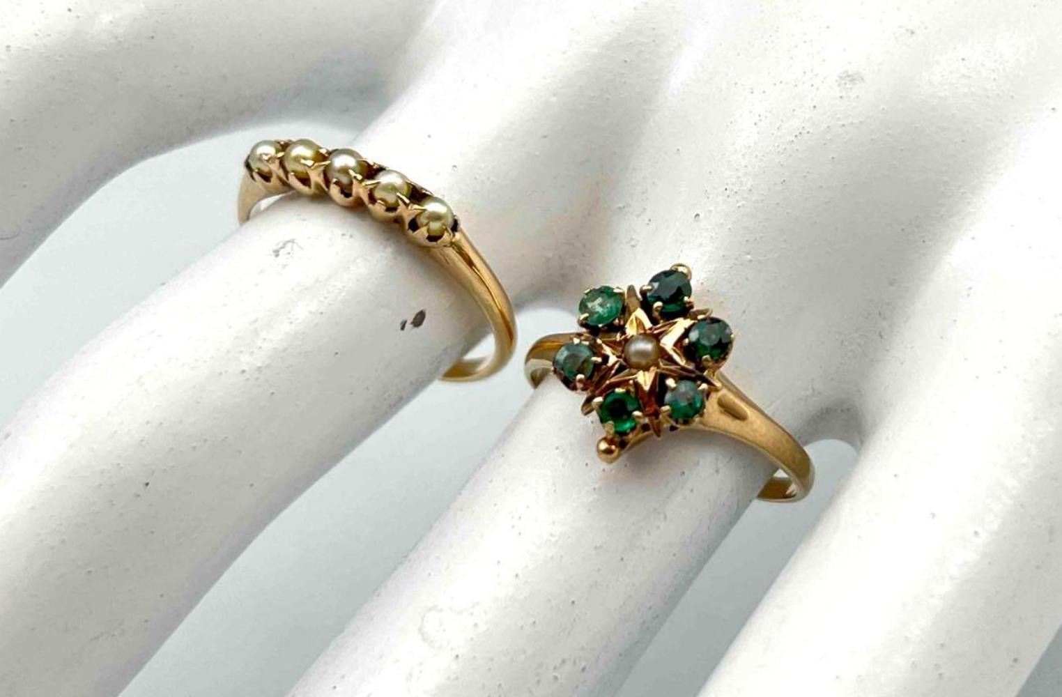 2 Antique 10K Seed Pearl Rings. 2.8g. Unmarked, Test As 10K. Larger Ring Front Approximately 0.375L x 0.375W in. Ring Size 5.5. ALL CREDIT CARDS WILL BE MANUALLY VERIFIED PRIOR TO SHIPMENT.