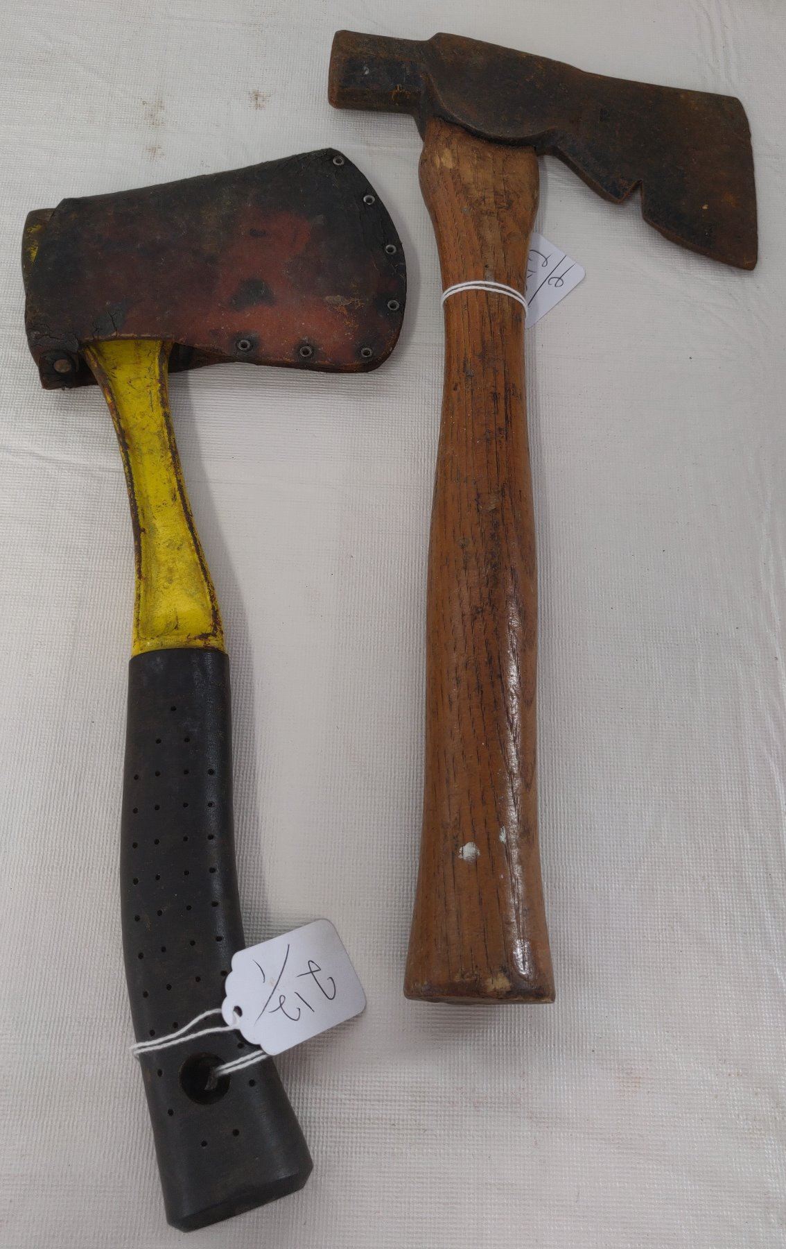 2 Antique Axes, c. 1920s. Made of wood, leather and steel, one measures 13" x 6" and the other is 12" x 5". Bridgeport Scout, Collins brands. Condition: Rust and wear, see images. Shipping: $20.00 w/insurance and signature.