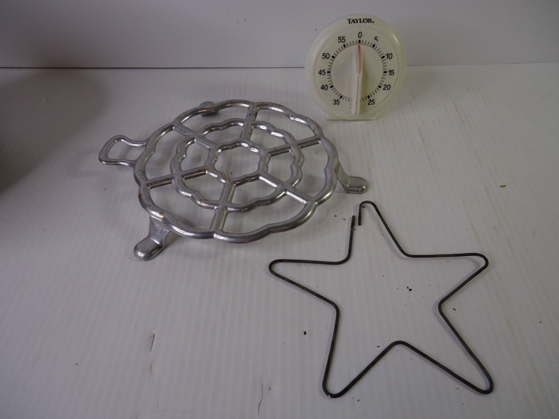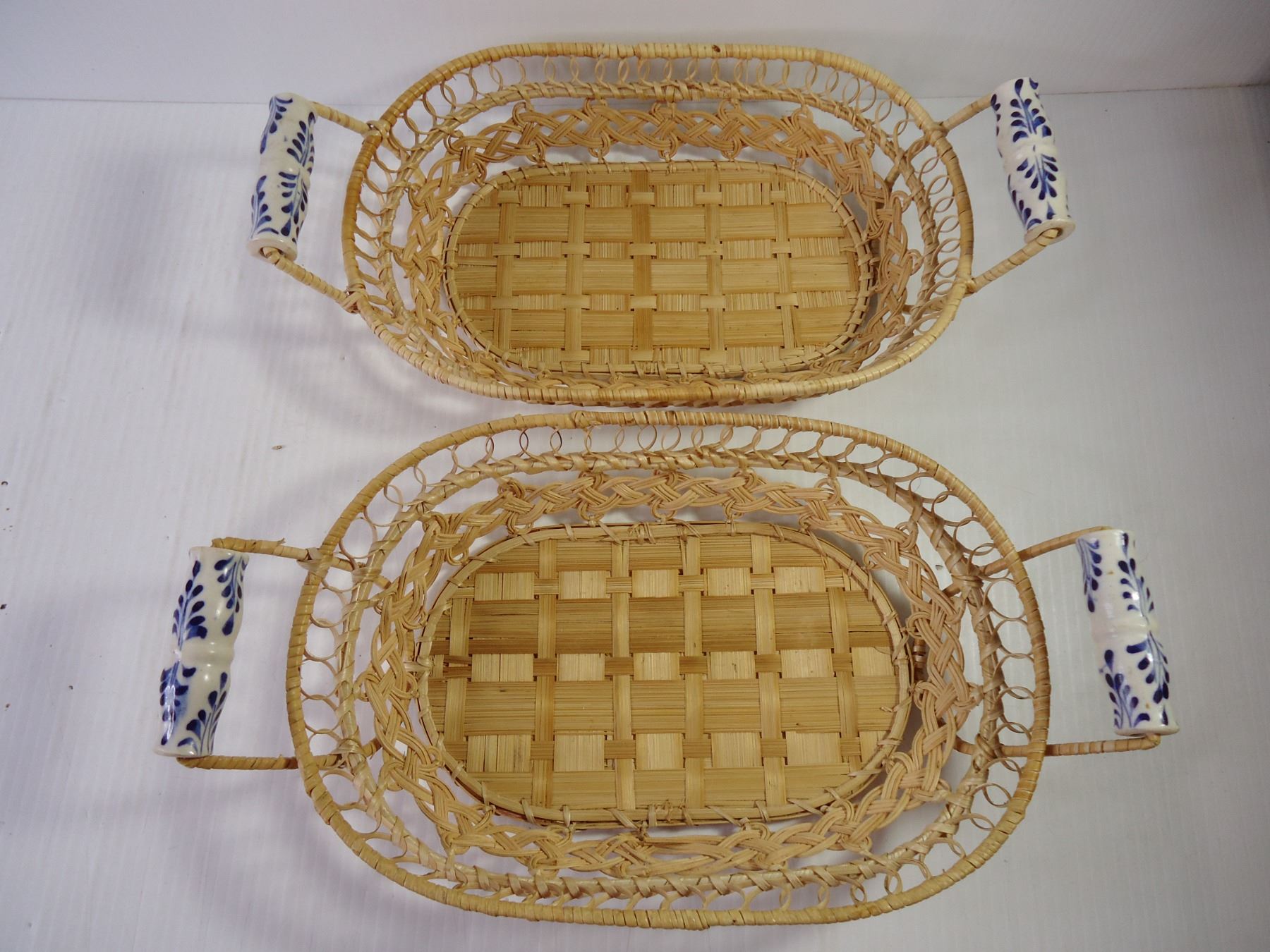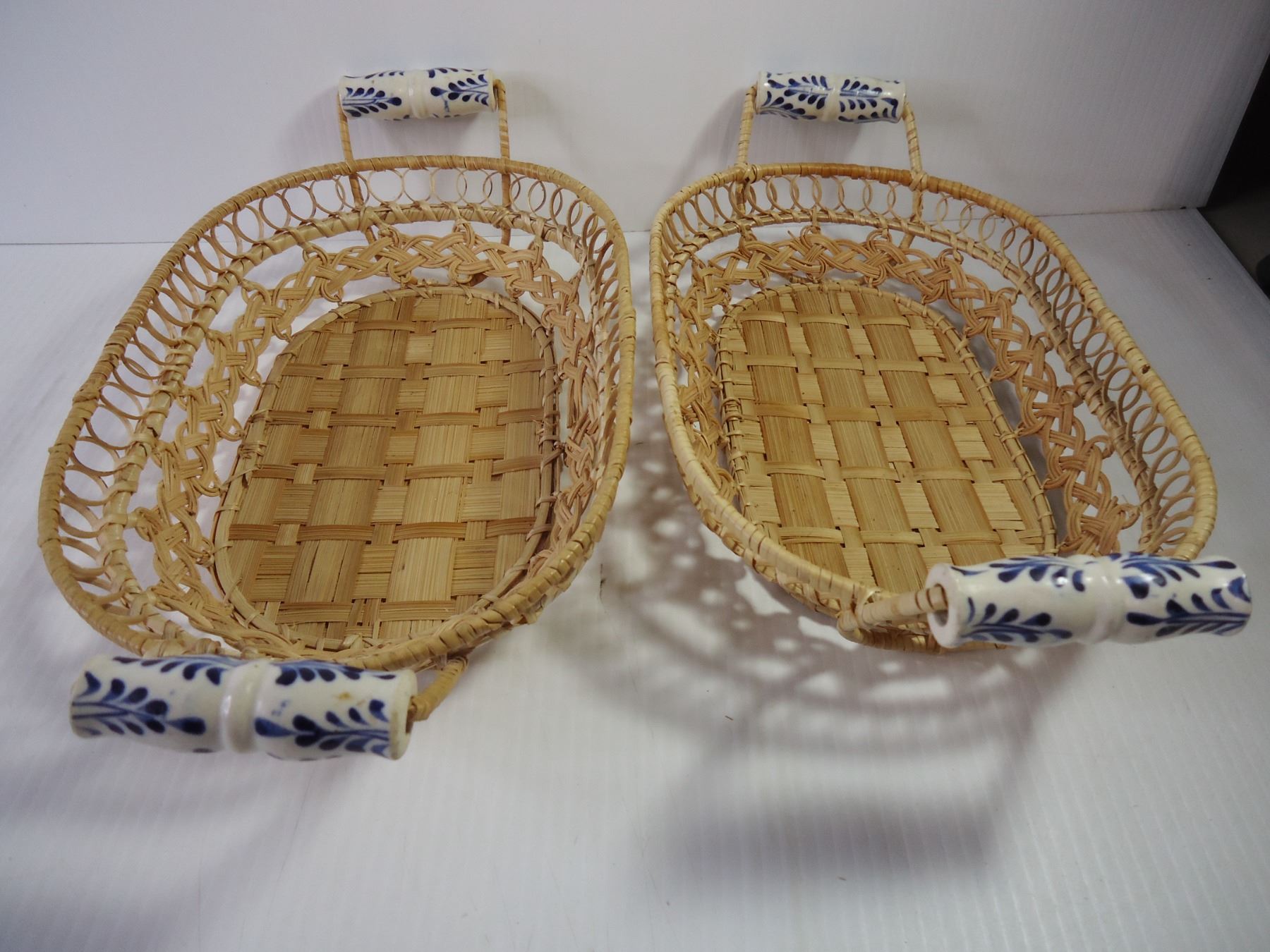 (2) Antique Baskets with Delft Ceramic Handles, Stoneware Pottery, Trivet, Timer and Burner Guard