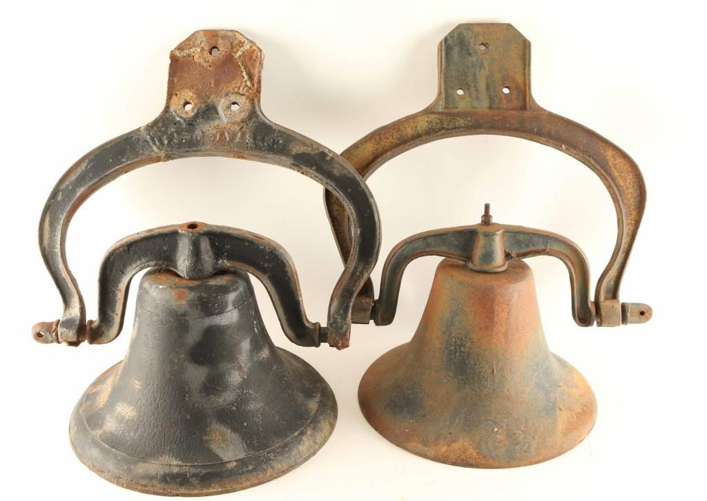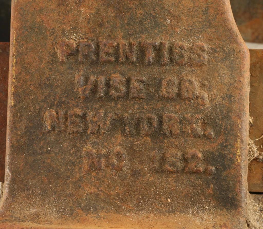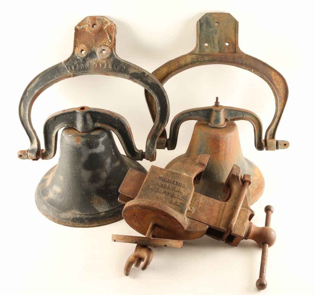 (1) Antique Cast Iron Church bell with a nice rusty patina measures approx 9" tall X 12" (1) Antique Cast Iron Bell measures approx 10 1/2" tall X 14" wide (1) Vintage vise marked "Prentiss Vise Co" "New York" "No. 182" measures approx 15" tall X 17" wide and weighs 66 lbs