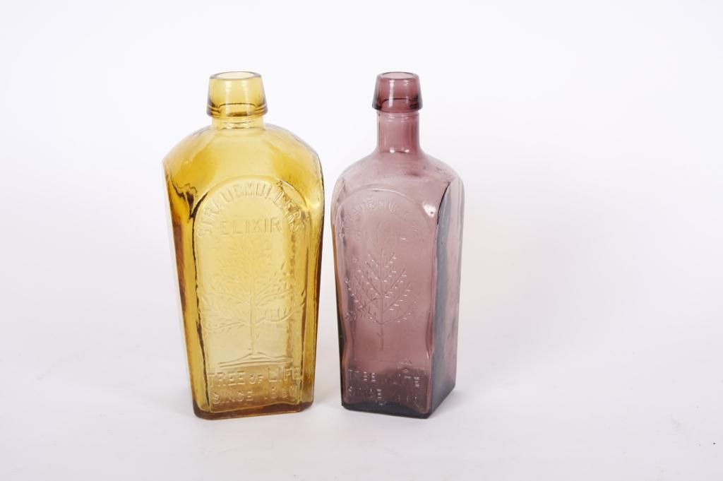 2 Antique Bottles Straubmullers Elixier"The Golden Tree of Life", One Purple Glass and One Mustard.