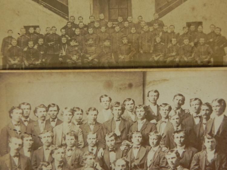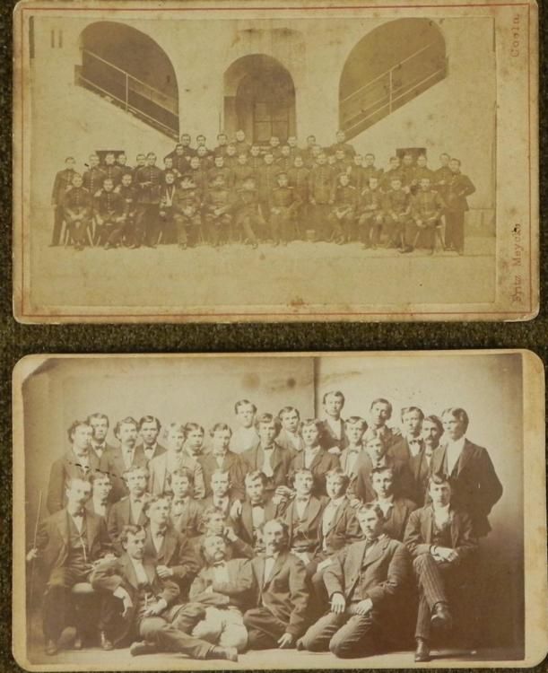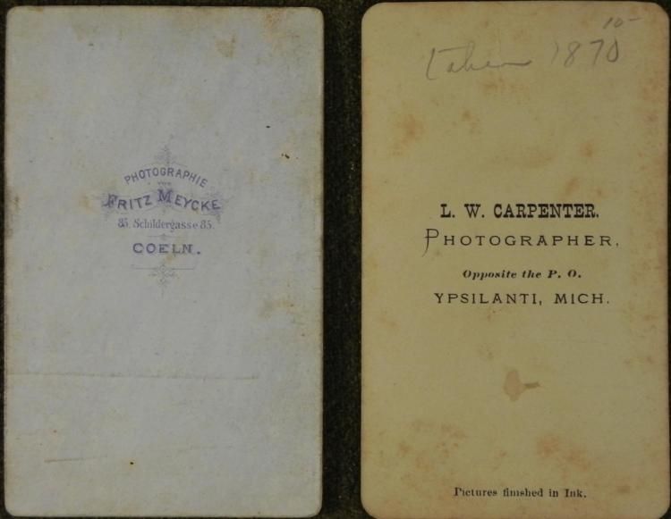 These are two antique Carte de Visite photographs depicting large groups of men. One appears to be a military unit, possibly Naval, some with hats and insignia. This is an outdoor shot in front of a building. The back side has the name of the studio, in Coeln, Germany. The other is a studio portrait of men of various ages, all dressed in their finest. The photographer is named, and the town of Ypsilanti, Michigan. There is also something penciled in on back, with the date 1870. The size of the photos is standard, 2 1/2 x 4 inches. They are in good condition, with clear images, but some spotting, staining, and wear. * * Its rare to find groups this large in photos like these, and the military is especially good.