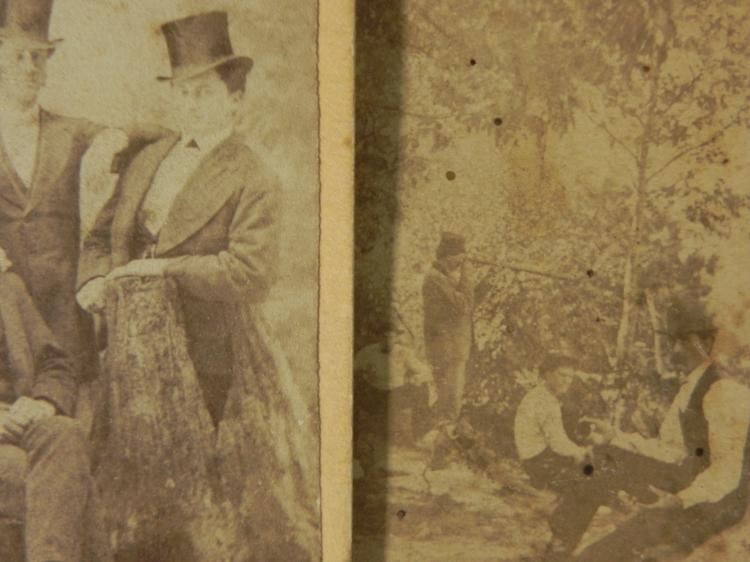 Here are two antique Carte de Visite photographs of jaunty men, with some nice hats. One is an outdoor shot with four men, including one looking through a telescope, and one holding a wine glass. The other has five men with an upper class appearance. The back has the name of the studio, in Louisville, Ohio. The size of the photos is standard, 2 1/2 x 4 inches. They are in good condition, with clear images, but some spotting, staining, and small tear. These are fine photos for your album.