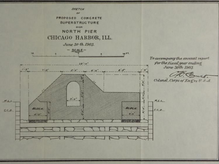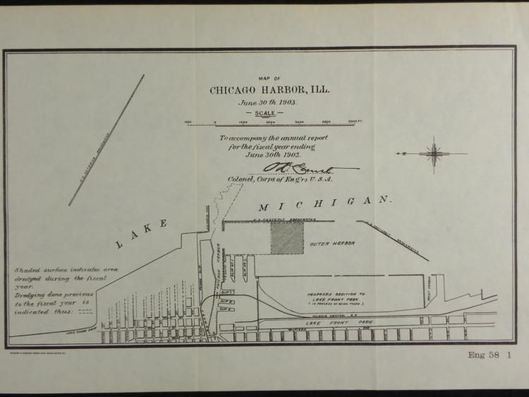 Here is a sketch of a proposed structure over Chicago's North Pier, and a map of the harbor area, both from the same time period. Titles: "Map of Chicago Hargbor, ILL;" "Sketch of Proposed Concrete Superstructure over North Pier" Medium: Black and white e