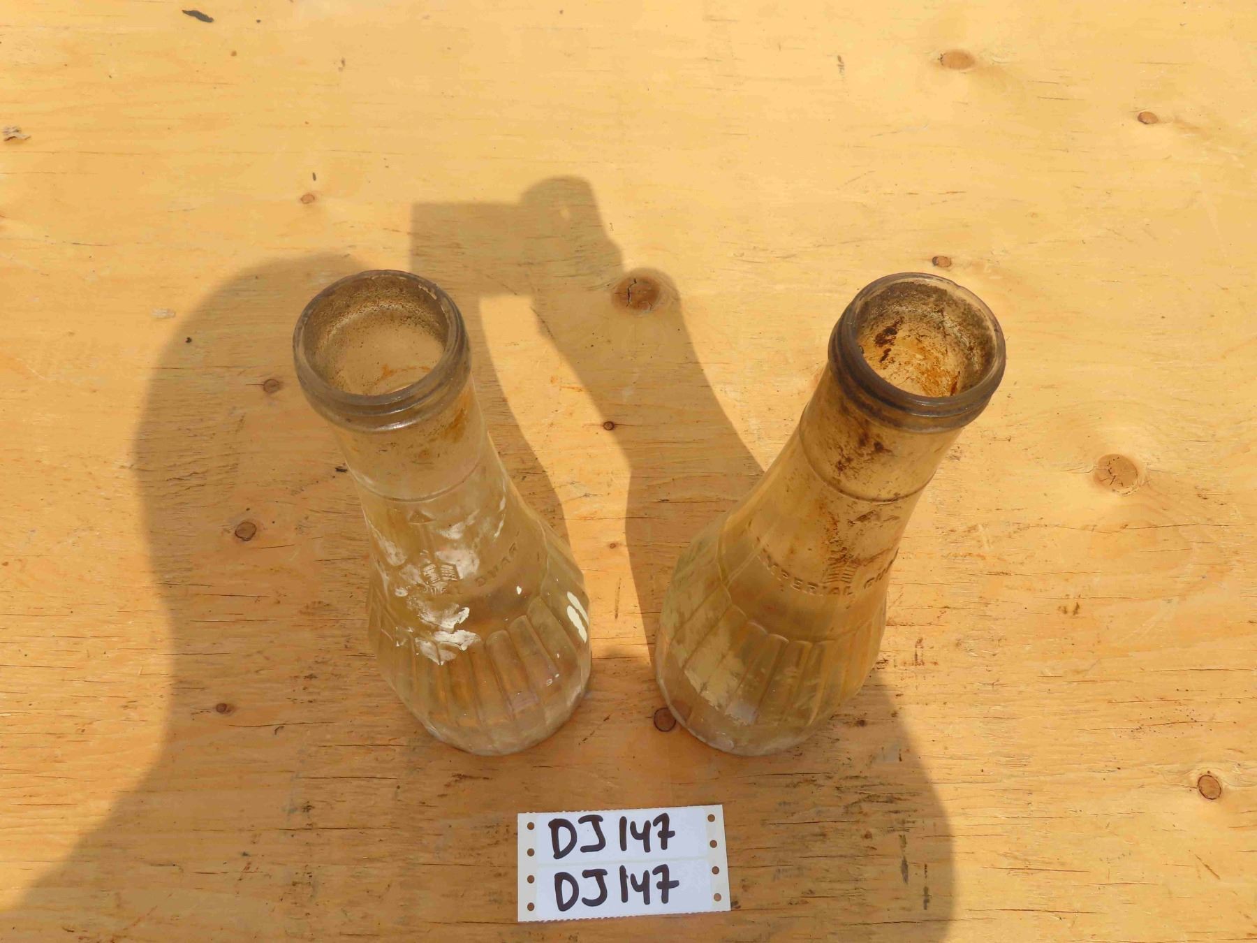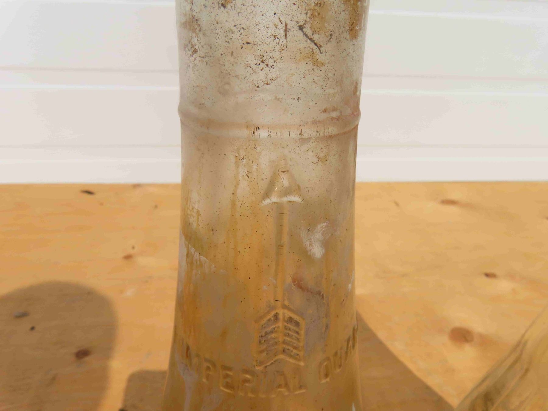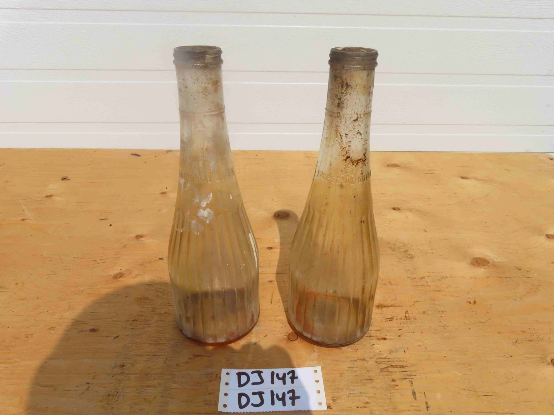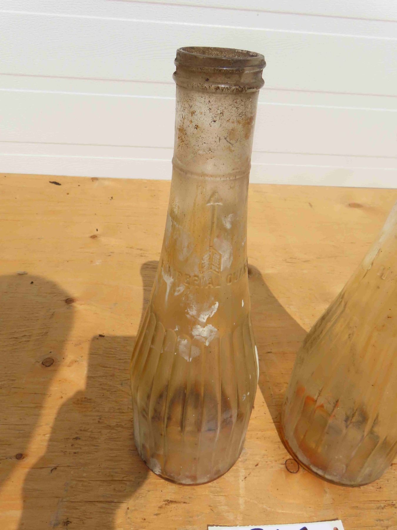 2 Antique Embossed + Ribed 1 Quart Oil Bottles