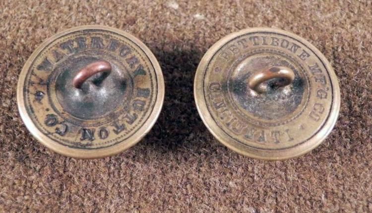 2 Civil War era State Antique Tunic Buttons in gilt * * Michigan: Obverse: Elk, shield and eagle; Reverse: WATERBURY BUTTON CO.Missouri: Obverse: Bears with state seal and motto; Reverse: PETTIBONE MF'G CO. CINCINNATIDiameter: 23 mmCondition: Very good, with minor surface wear