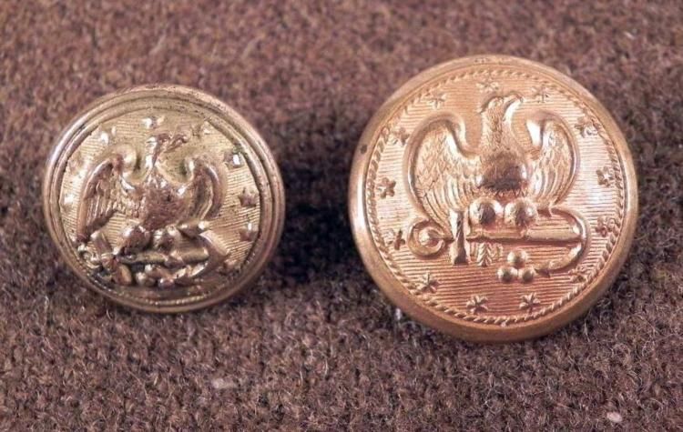 2 different size Civil War era Antique Tunic Buttons in gilt * * Obverse: Eagle and anchor, with stars; Reverse: EXTRA QUALITY, with shank; one is unmarked, with holes * Diameter: 18 mm, 23 mmCondition: Very good, with minor surface rub