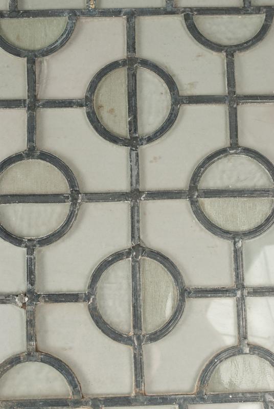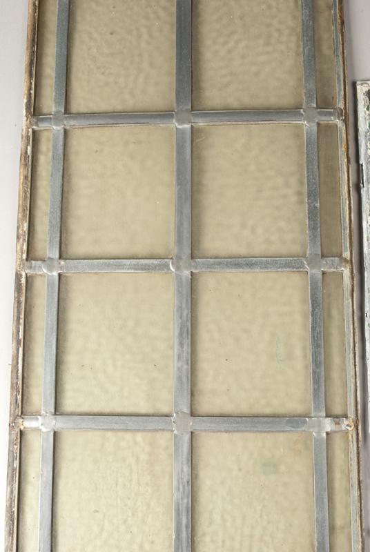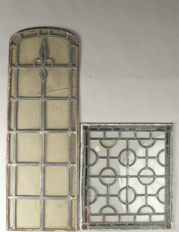 Includes a long and narrow window with yellow hue glass, 36" L x 12.5" W. Together with a smaller window circular, half ribbed designs, 18.75" x 16.25". Section of glass near top on larger with crack and two small cracks on smaller window.