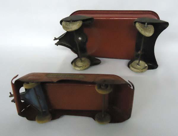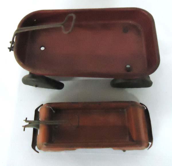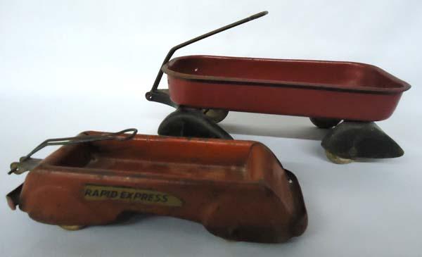 2 Antique Metal Toy Wagons One Rapid Express. Largest wagon measures approx. 5'' x 10'' x 3.25''. SHI $20.