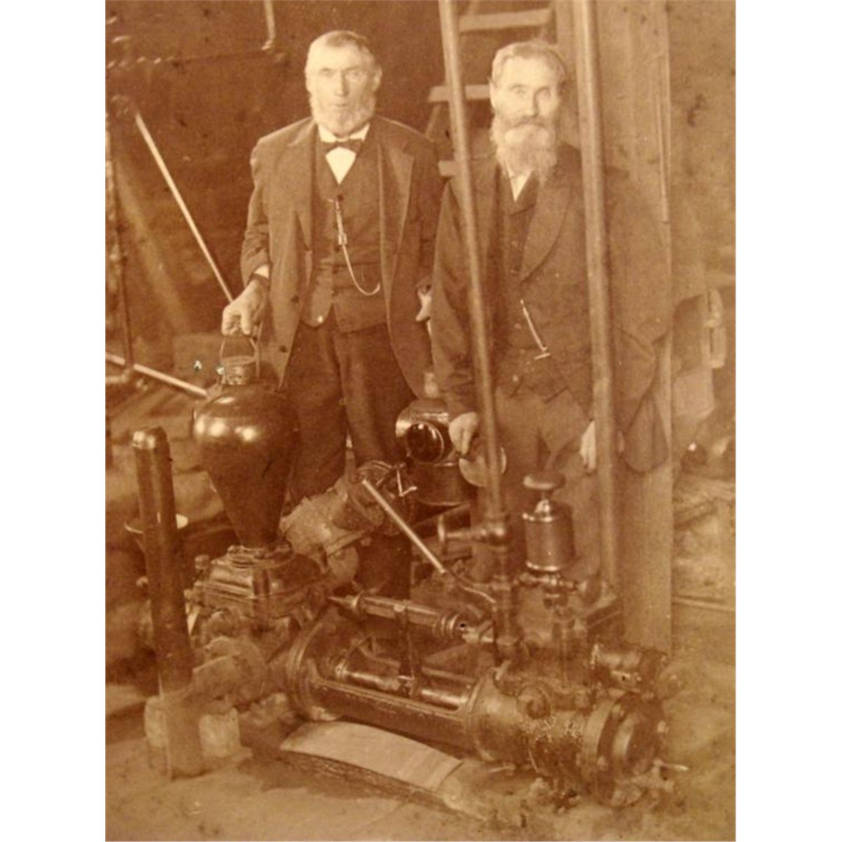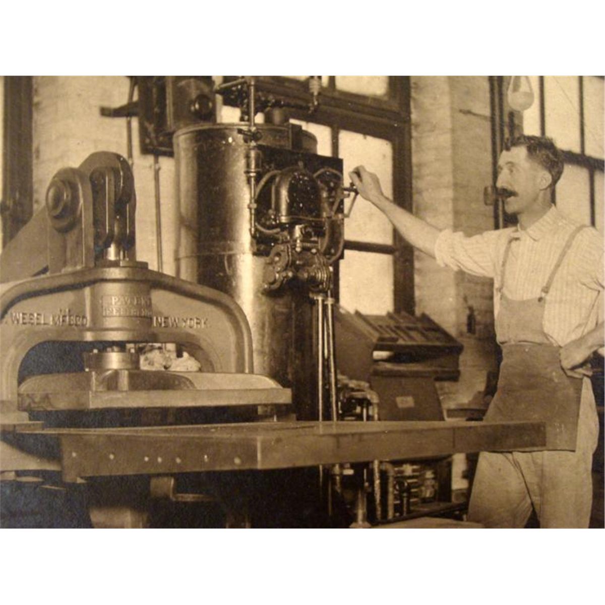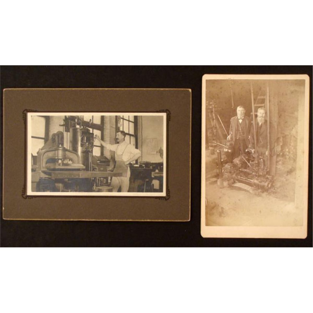 These 2 antique photos depict some kinds of machinery. Both are albumen prints on backings, one card measuring 5 1/4" x 7 1/2", and the other 4 1/4" x 6 1/2". One shows a machine from Wesel Mfg. Co. and its operator, most likely a electrotyping, stereotyping or photoengraving machine. The other is a machine with pipes, and two older gentlemen, one apparently holding a lantern. Both photos are clear, and in very good condition.. * These are fine early machinery images.