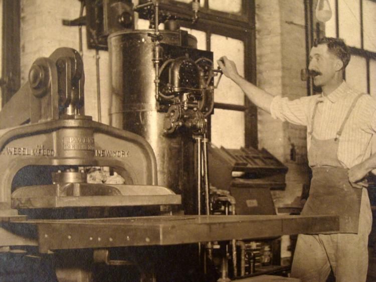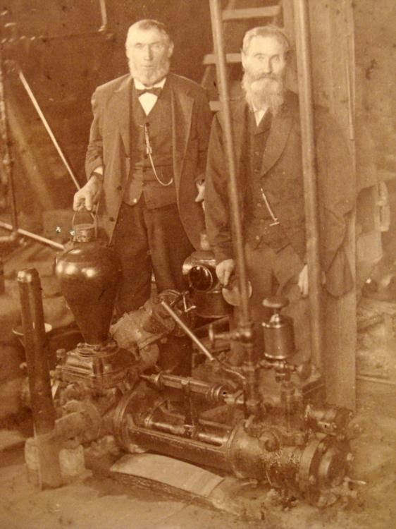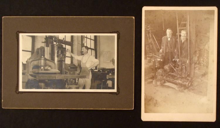 These 2 antique photos depict some kinds of machinery. Both are albumen prints on backings, one card measuring 5 1/4" x 7 1/2", and the other 4 1/4" x 6 1/2". One shows a machine from Wesel Mfg. Co. and its operator, most likely a electrotyping, stereotyping or photoengraving machine. The other is a machine with pipes, and two older gentlemen, one apparently holding a lantern. Both photos are clear, and in very good condition.. * These are fine early machinery images.