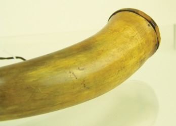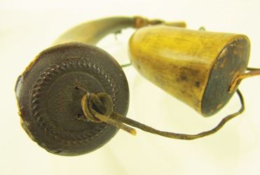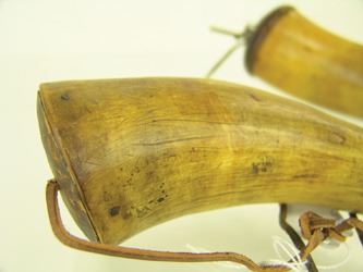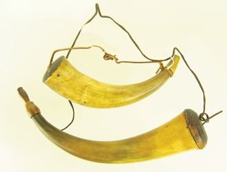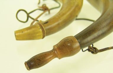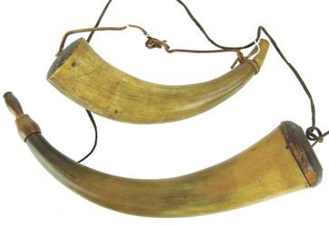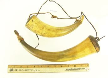 Pair of older, hand carved horns with wooden caps, the larger also with a stopper in the tip. Very good condition. Early/Mid 1900s. 9", 13"