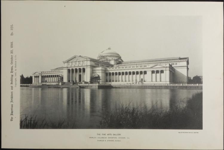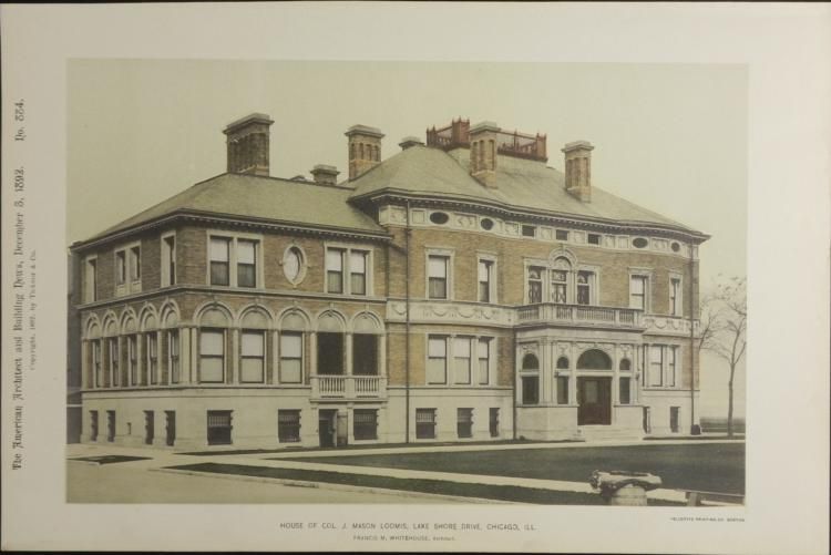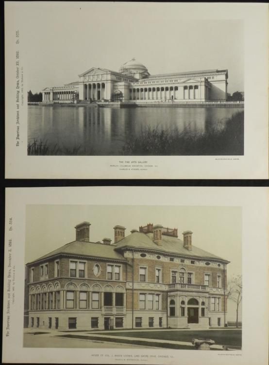 These impressive Chicago buildings include one that now houses the Museum of Science and Industry, and one of a successful lumberman, which is now gone. Titles: "Fine Arts Gallery, World's Columbian Exhibition;" "House of Col. J. Mason Loomis, Lake Shore Drive" Medium: Black and white and colored etching on paperPublication: American Architect and Building NewsDate: 1892Printer: Heliotype Printing Co., BostonSheet size: 12 7/8" x 8 3/8"Condition: Very goodThese are great pieces of Chicago architectural history.