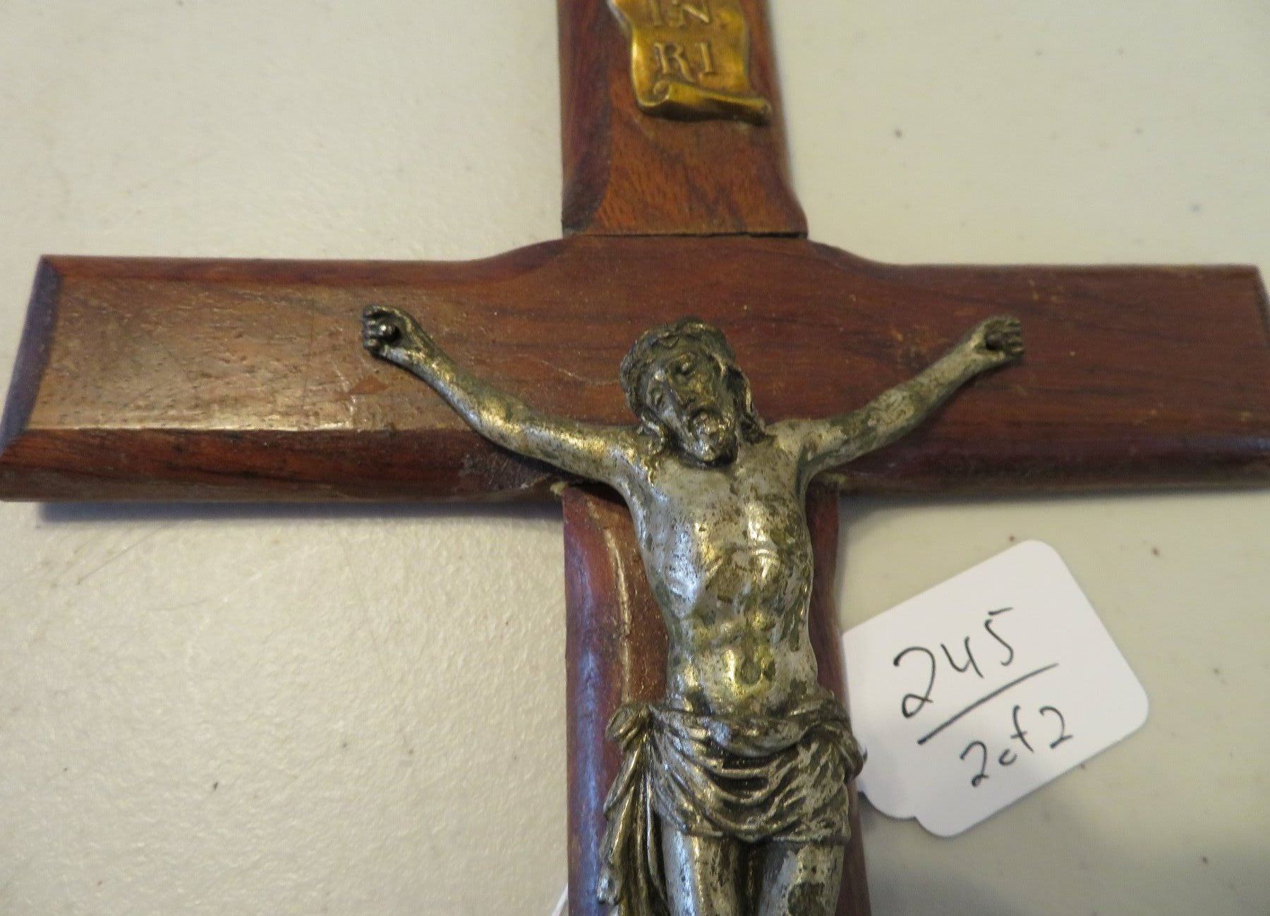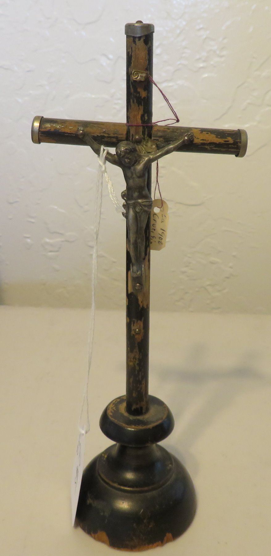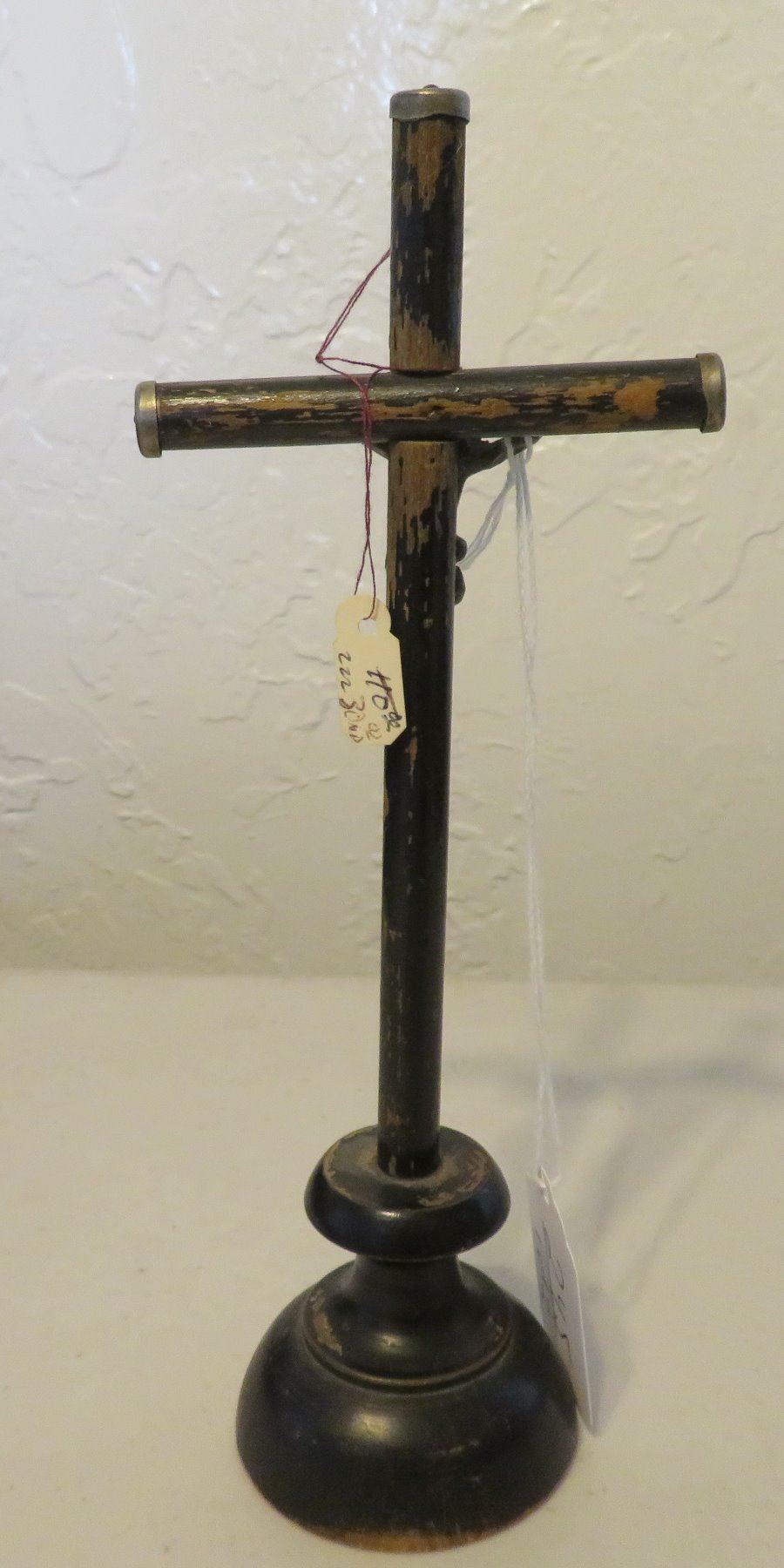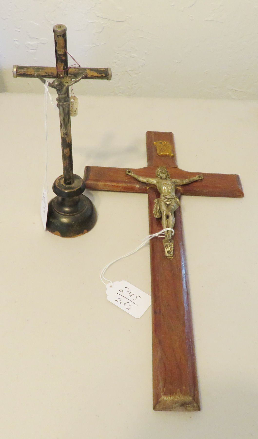 2 Antique Religious Crucifixes, c. 1900-20s. Made of wood, brass and metal alloy, the items measure 7 1/4" x 13 3/4" x 1 1/4" and 3 1/4" x 2 1/4" x 8 3/8". Mexico. INRI plaque, Jesus of Nazarath, the King of the Jews. Smaller, c. 1900s item on round stand with silver end caps and figure. Condition: good, heavy patina, see images. Shipping: $30.00 w/insurance and signature, due to value.