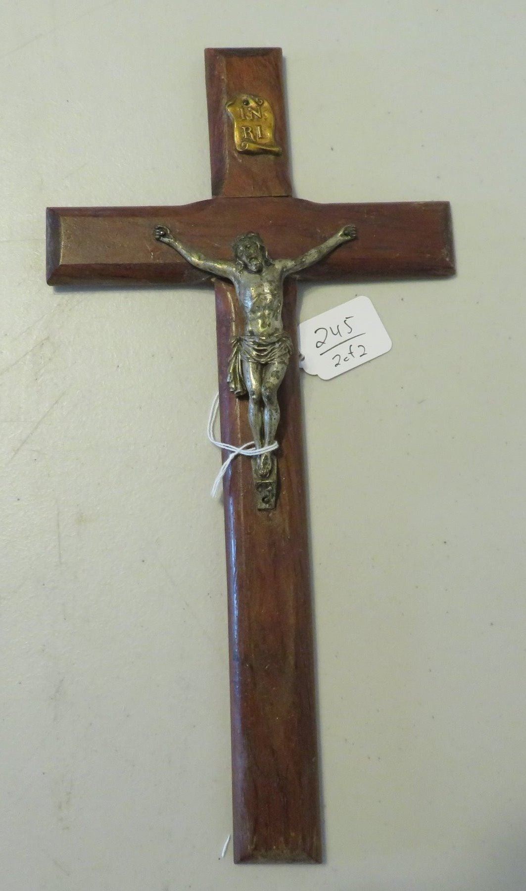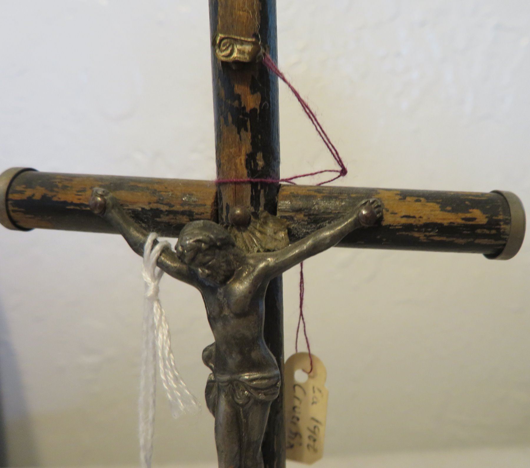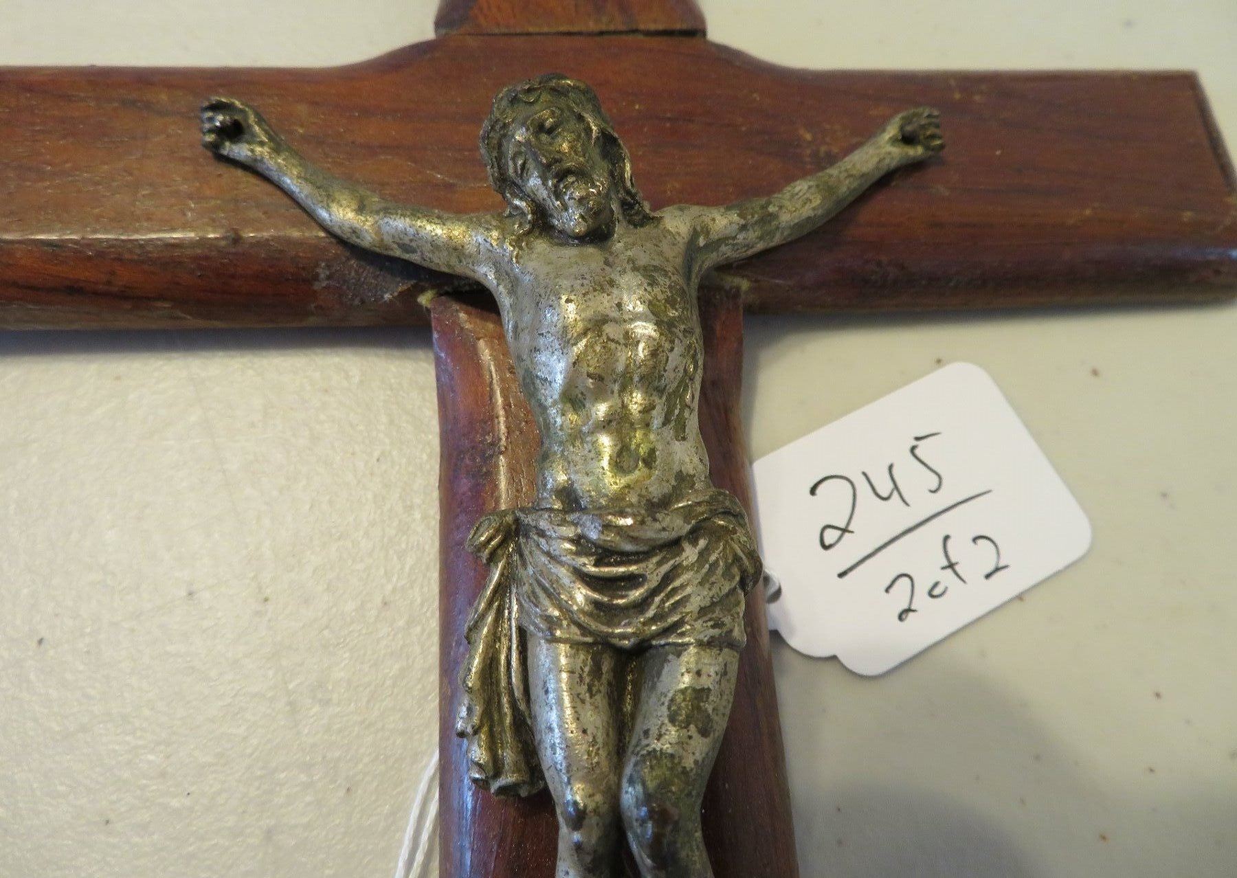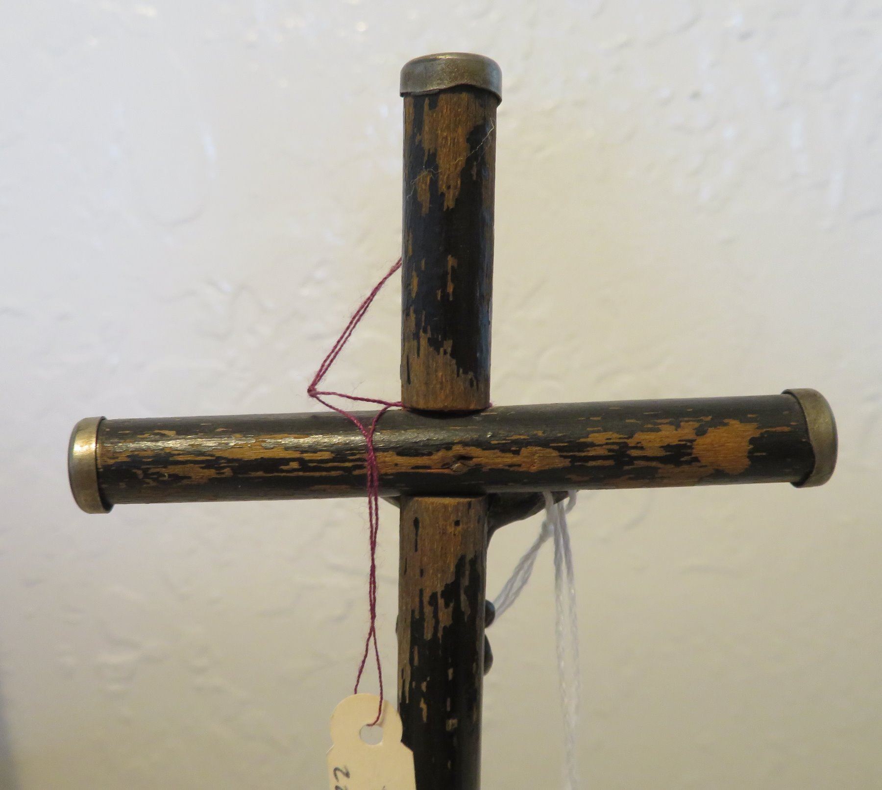 2 Antique Religious Crucifixes, c. 1900-20s. Made of wood, brass and metal alloy, the items measure 7 1/4" x 13 3/4" x 1 1/4" and 3 1/4" x 2 1/4" x 8 3/8". Mexico. INRI plaque, Jesus of Nazarath, the King of the Jews. Smaller, c. 1900s item on round stand with silver end caps and figure. Condition: good, heavy patina, see images. Shipping: $30.00 w/insurance and signature, due to value.