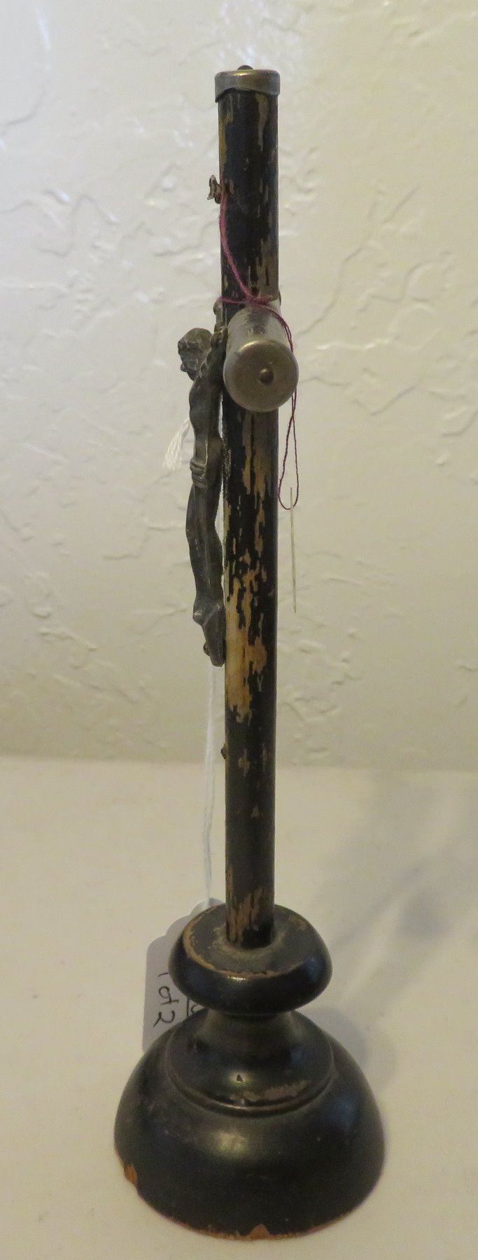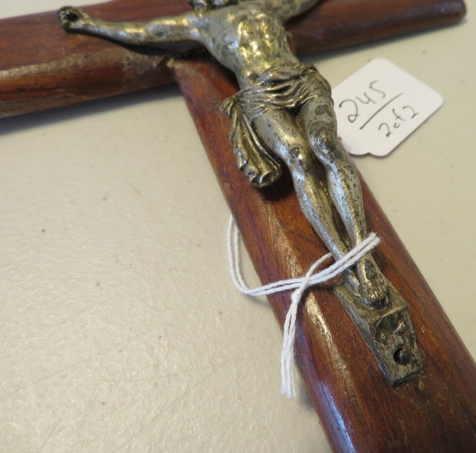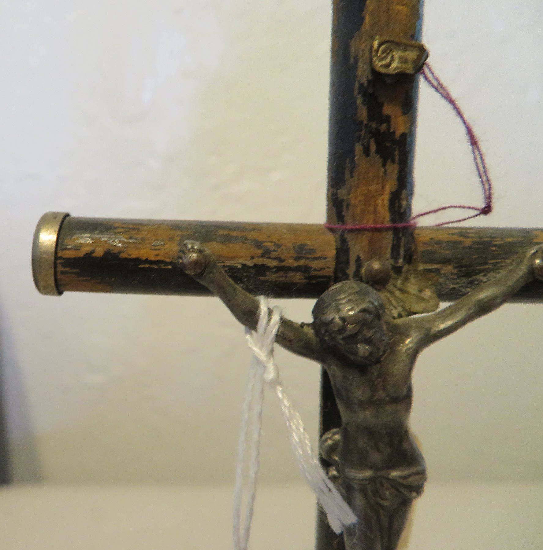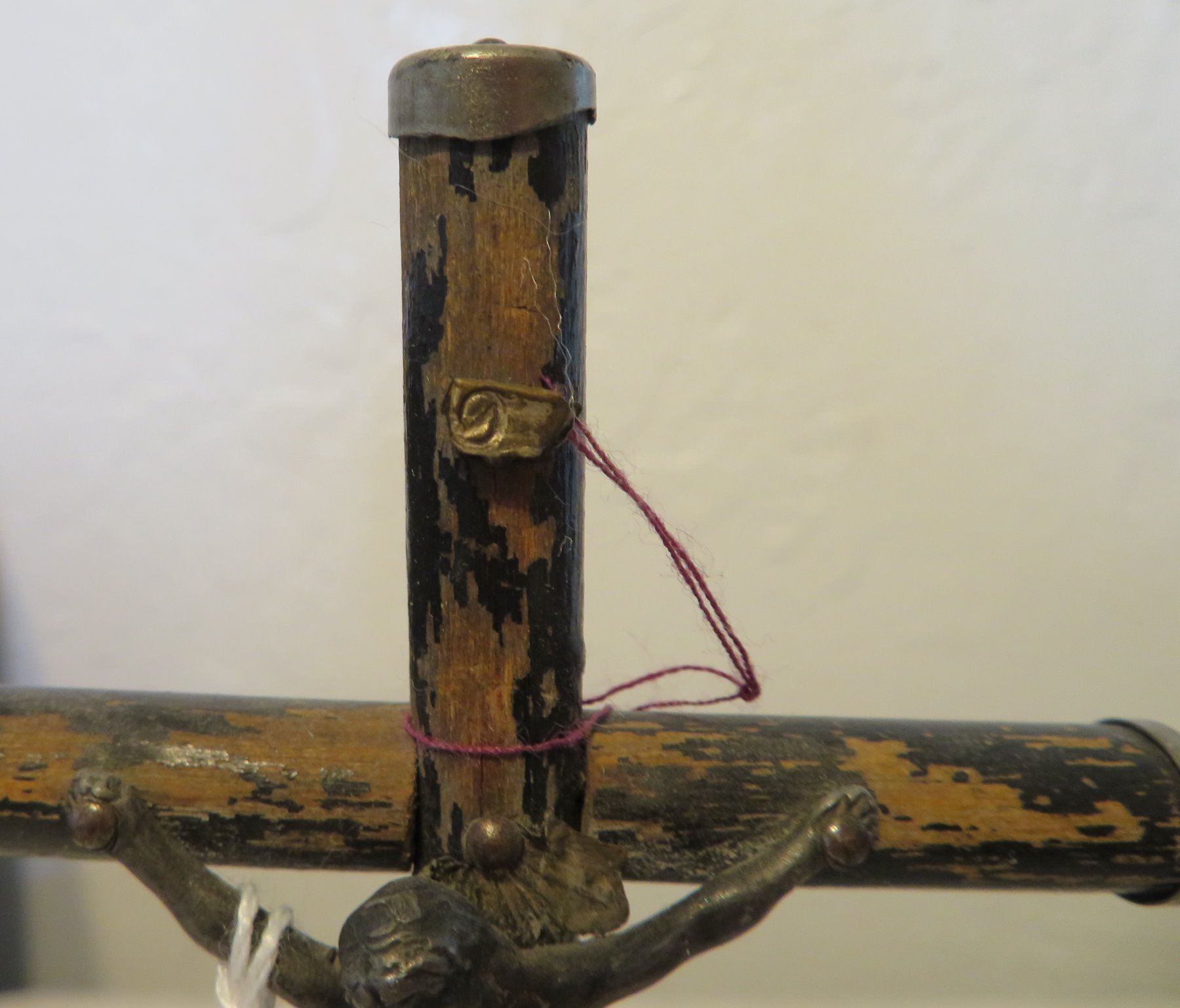 2 Antique Religious Crucifixes, c. 1900-20s. Made of wood, brass and metal alloy, the items measure 7 1/4" x 13 3/4" x 1 1/4" and 3 1/4" x 2 1/4" x 8 3/8". Mexico. INRI plaque, Jesus of Nazarath, the King of the Jews. Smaller, c. 1900s item on round stand with silver end caps and figure. Condition: good, heavy patina, see images. Shipping: $30.00 w/insurance and signature, due to value.