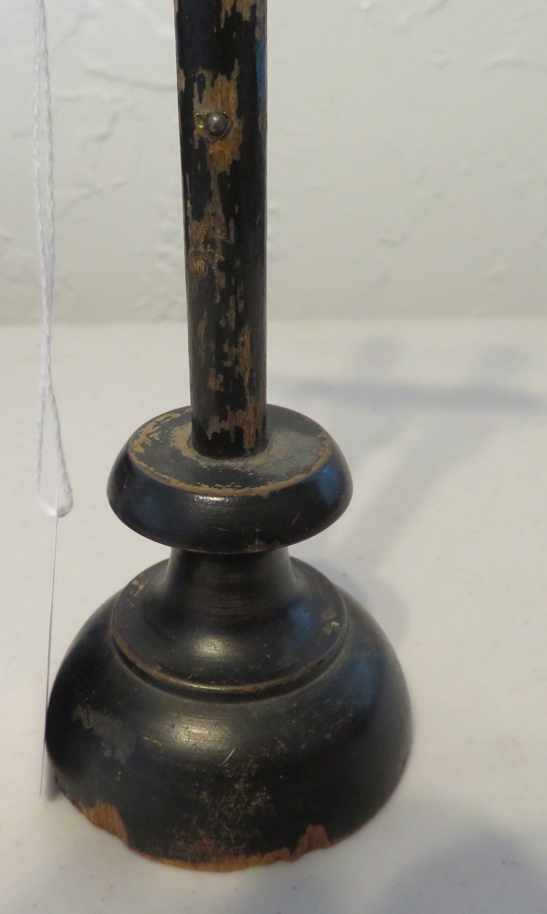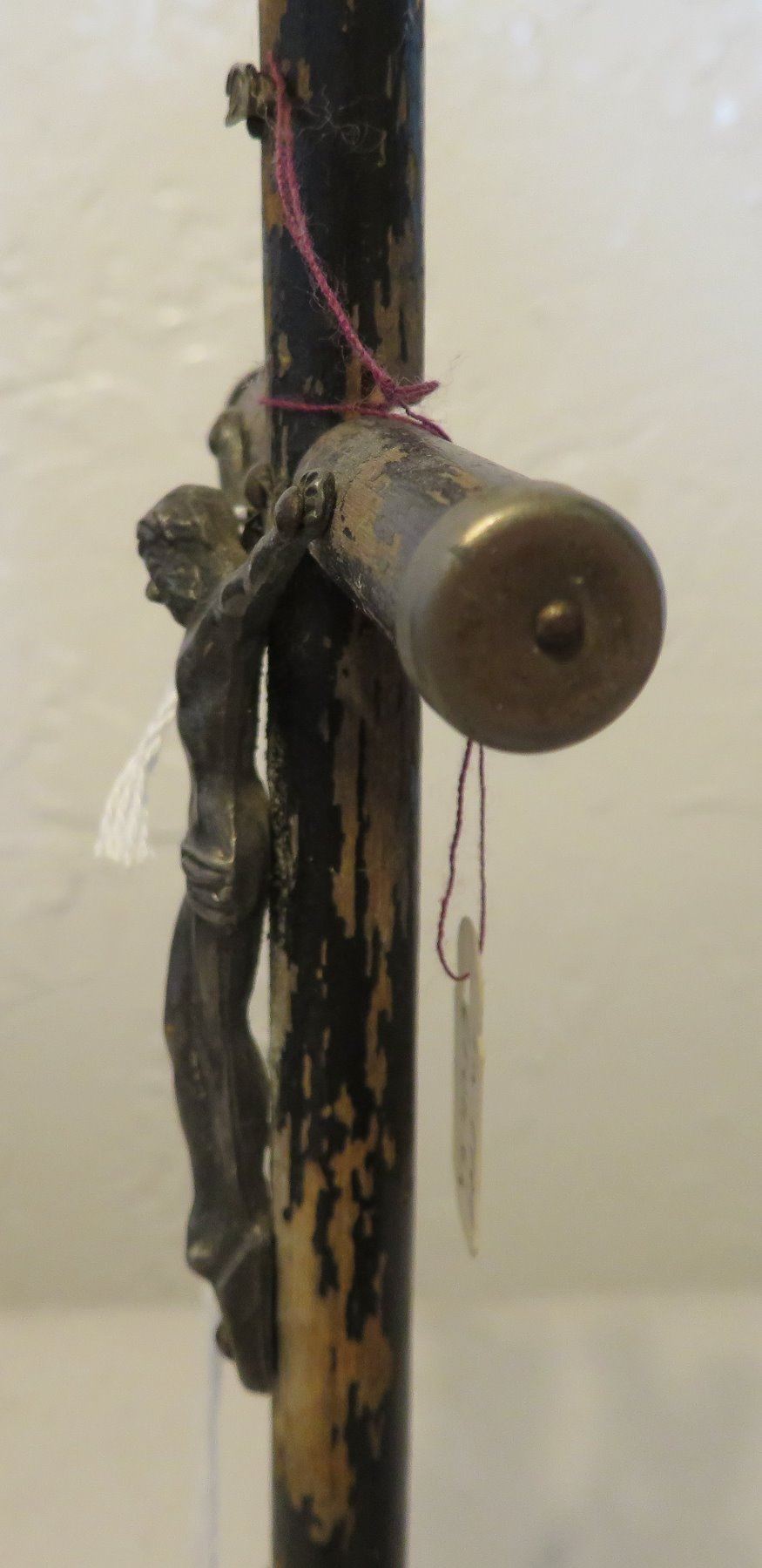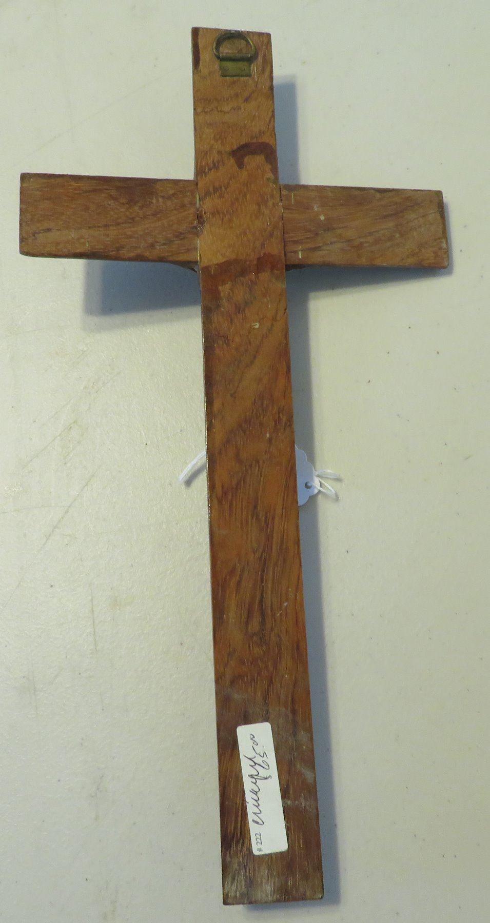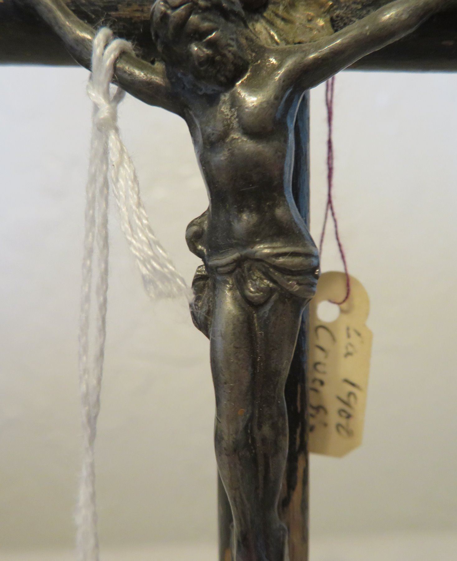 2 Antique Religious Crucifixes, c. 1900-20s. Made of wood, brass and metal alloy, the items measure 7 1/4" x 13 3/4" x 1 1/4" and 3 1/4" x 2 1/4" x 8 3/8". Mexico. INRI plaque, Jesus of Nazarath, the King of the Jews. Smaller, c. 1900s item on round stand with silver end caps and figure. Condition: good, heavy patina, see images. Shipping: $30.00 w/insurance and signature, due to value.
