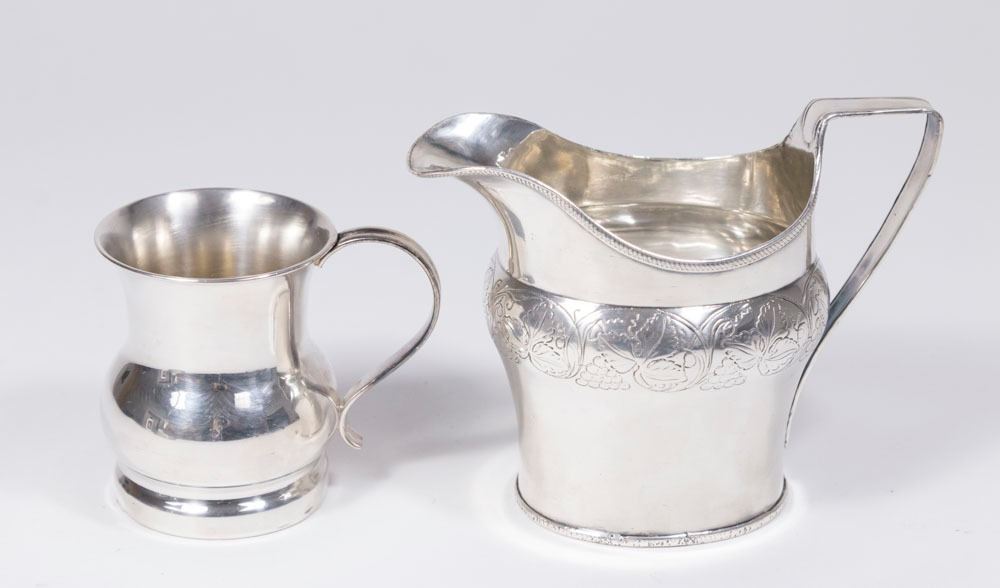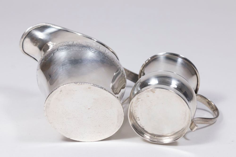 Acid tested. Unknown purity of silver. Total weight approx. 6.2 ozt (192.6 g). Larger approx. 4" H.
