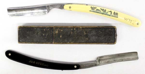 2 Antique Straight Edge Razors, 1 Original Box, includes H.B. & Co. Straight Edge made in Germany, hunting scene on cover, ''Wyatt's Warranted Cutlery'', the initials J.H.M. have been carved on the cover and Simmons Hardware Co. No. 8 Special Straight Edge, St. Louis, MO, ''Absolute Guarantee Feb. 18, 1902