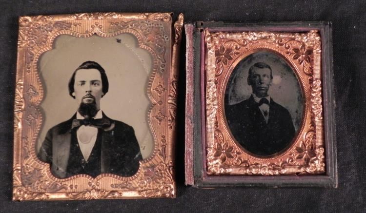 These two antique tintype photographic studio portraits are each of two men. One shows a man with long goatee and large bow tie It is a 1/6 plate size, approximately 2 1/2" x 3 1/4", and includes the foil embossed border, slightly worn. The other is a slim man. The image quality is dark and worn. It is 2 1/2" x 1 3/4", and includes an embossed foil border, and backing. They date from the late 1800's most likely. These are nice male portraits, especially with the goatee.