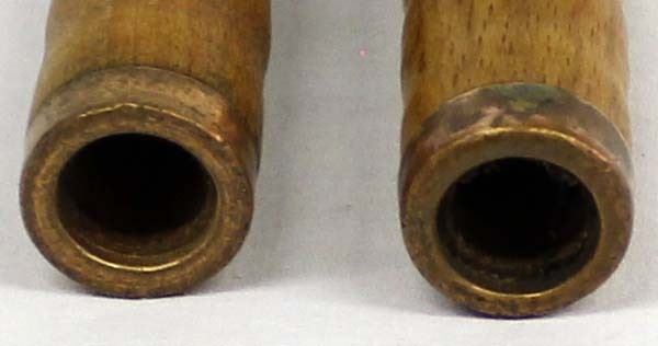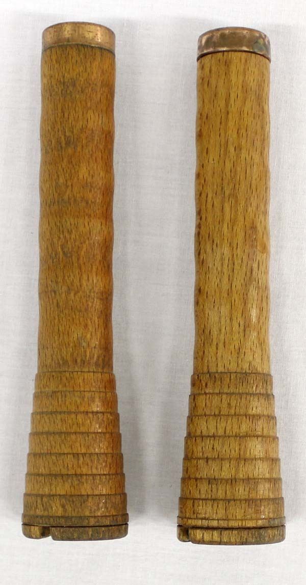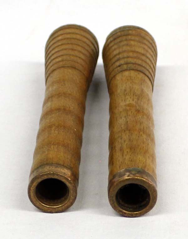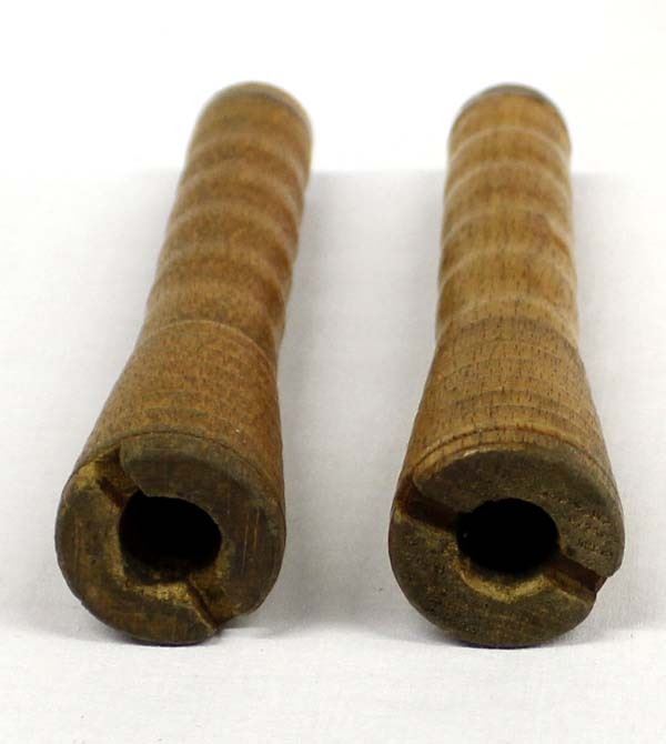 2 Antique Wood Textile Mill Bobbins, Victorian Era, measure 6''L x 1''W, copper caps on two ends
